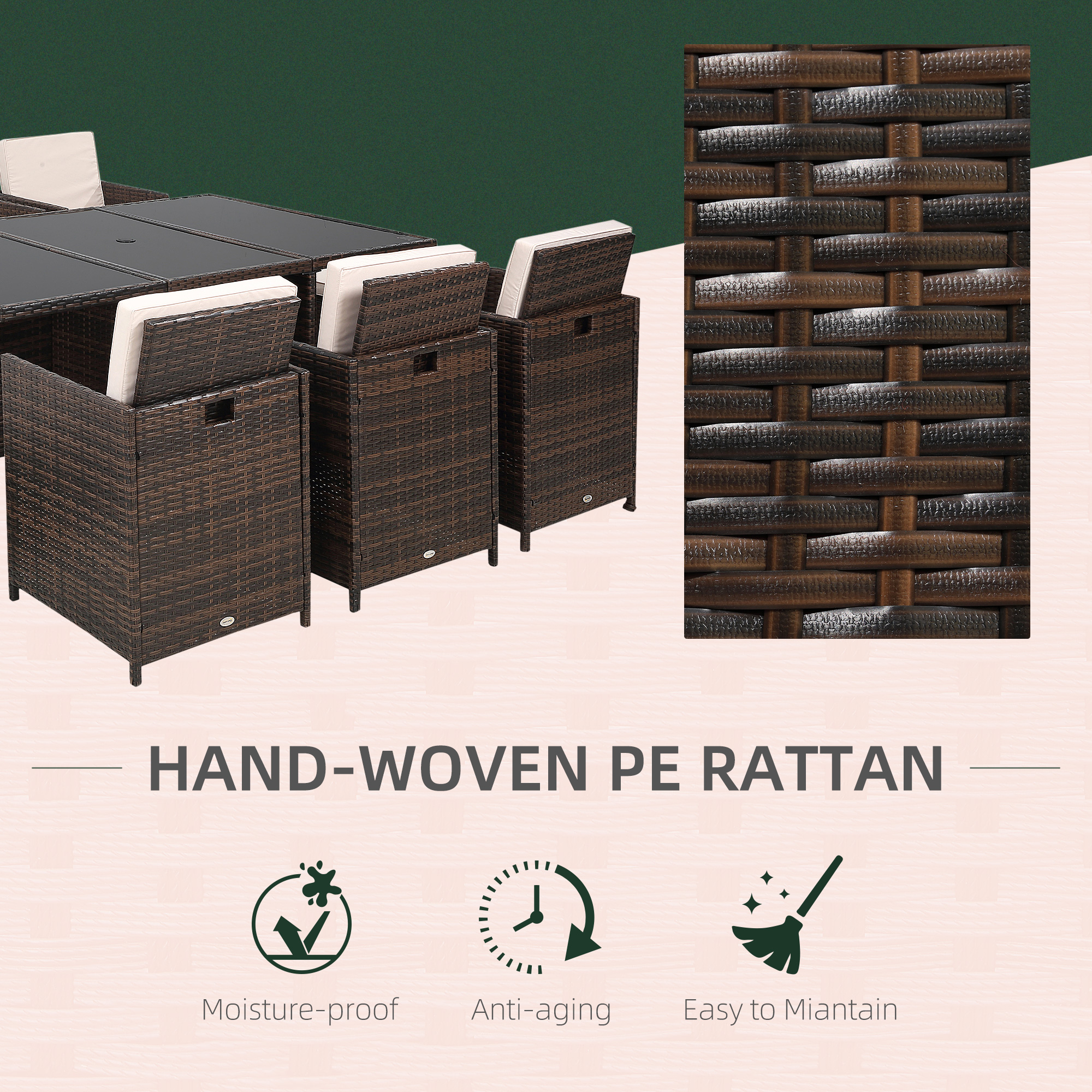 The Outsunny 11 pieces garden dining furniture set creates an inviting setting, ideal for patio, porch, poolside, and garden. The rattan cube dining sets is designed from a beautiful wicker material on a reinforced aluminum frame. The wicker and tempered glass table of the rattan garden dining set looks very fashionable and creates a modern style for your outdoor living area. The rattan cube dining set is suitable for any occasion, family dinners, parties, and more.
