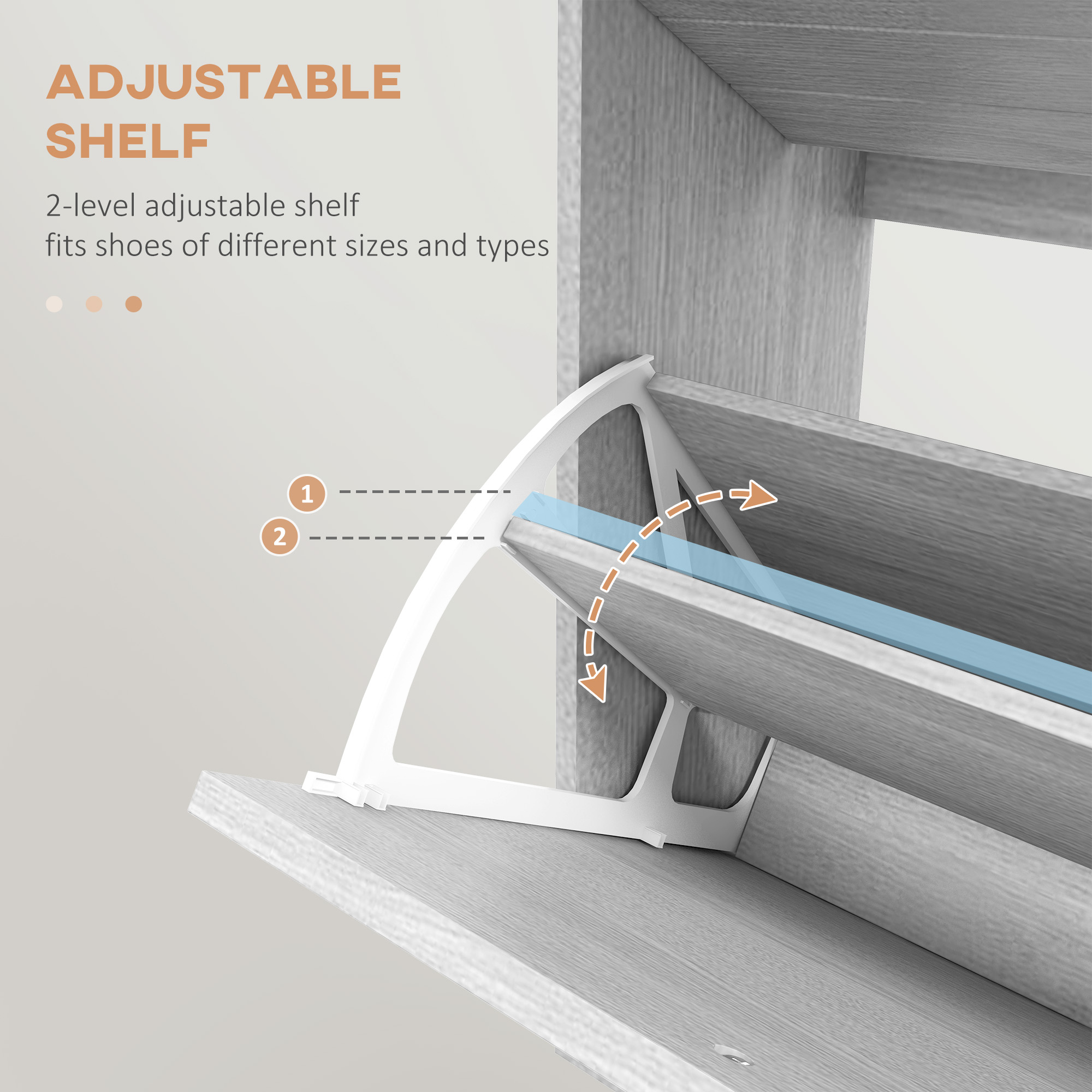 - Two-level adjustable shelf in the each flip drawer: adjust the size easily