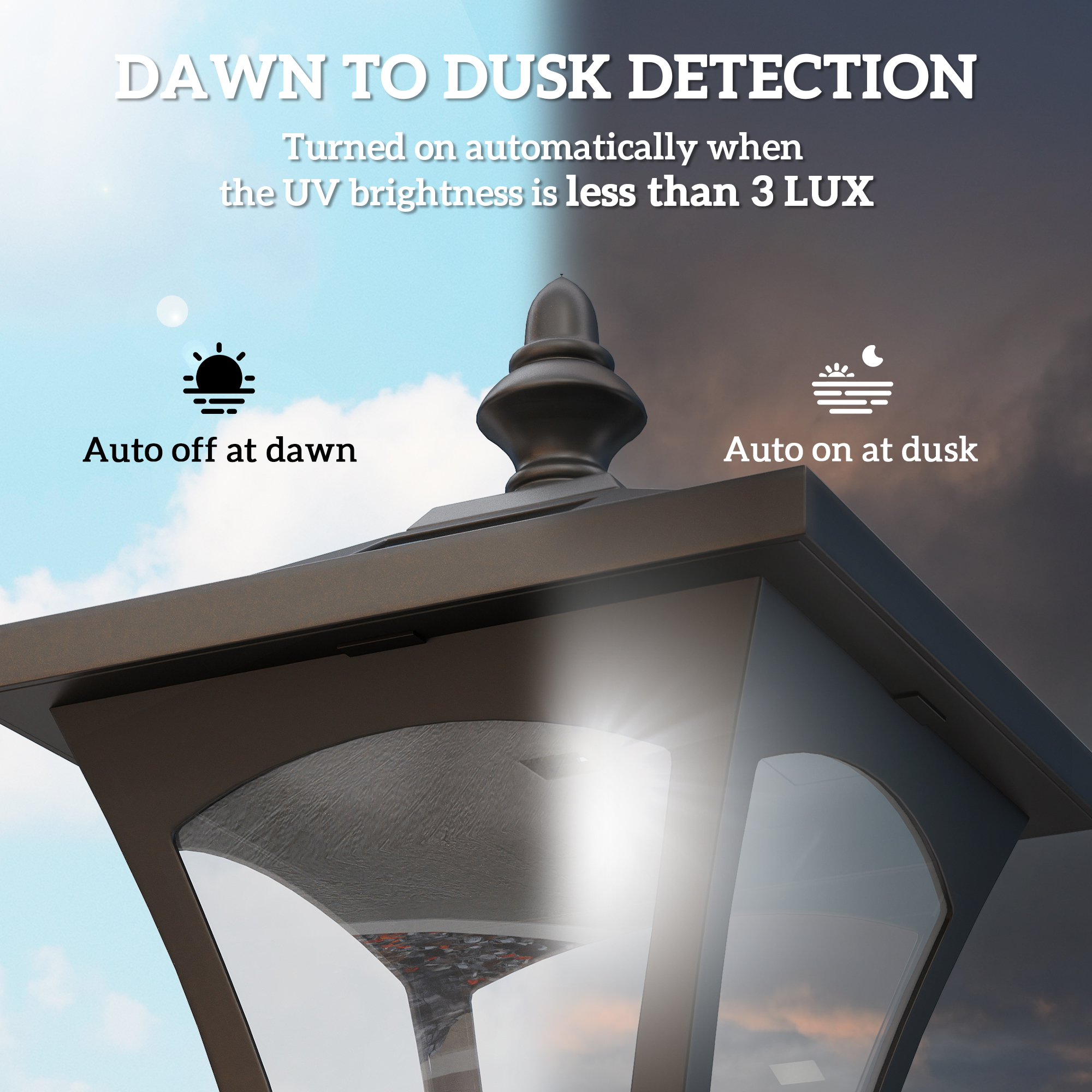 Features: - Automatic light sensor, so light activates when UV luminance is less than 3 lux