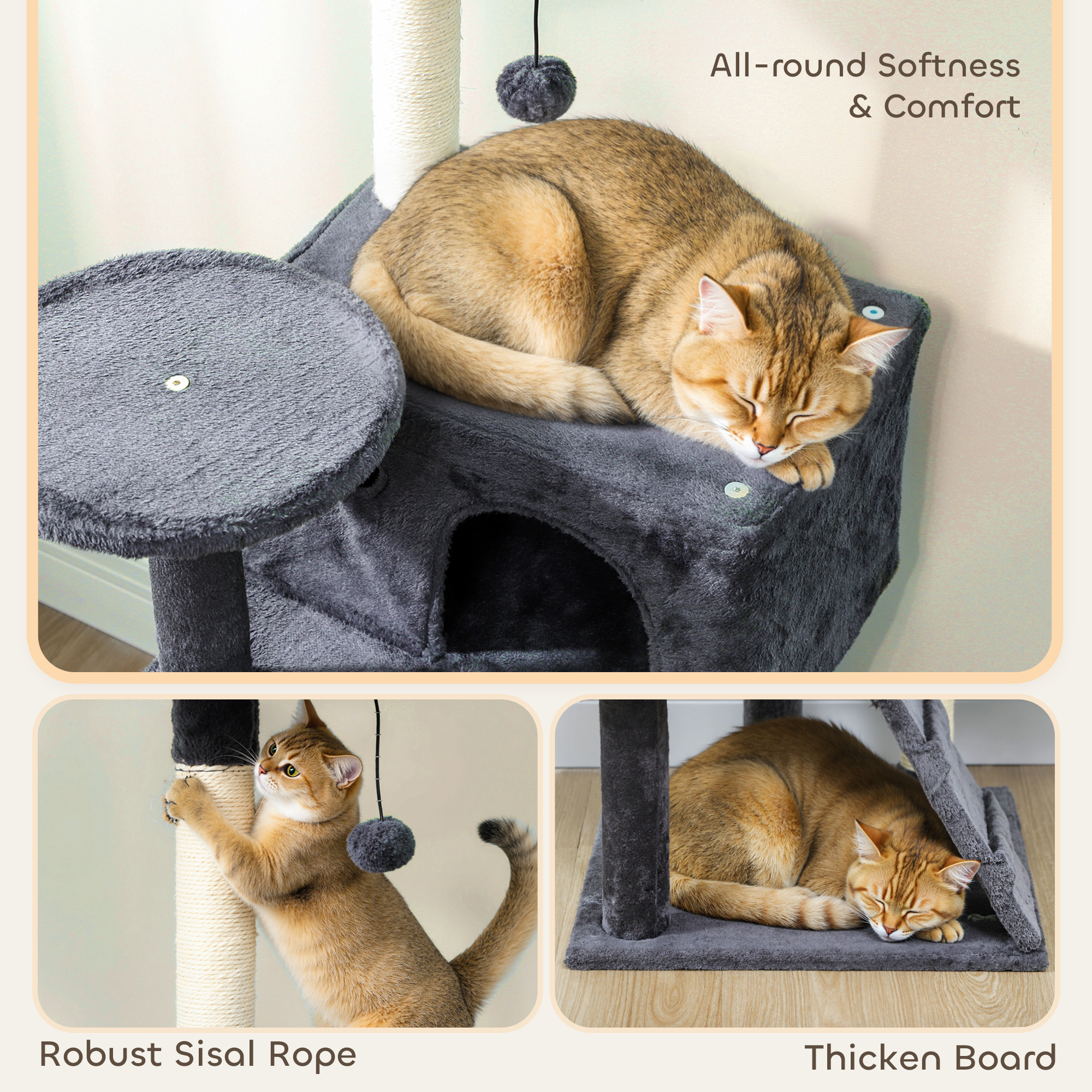 Introduce your cats to endless entertainment and comfort with this PawHut cat tree. It features multiple levels for climbing and jumping, complete with a hanging toy at the top to captivate playful pets. The sisal scratch posts are for clawing, while the cosy perches and private pet house provide comfy spots for relaxation. This cat tree offers a safe haven for climbing, napping and playing, allowing cats to enjoy their activities in safety.