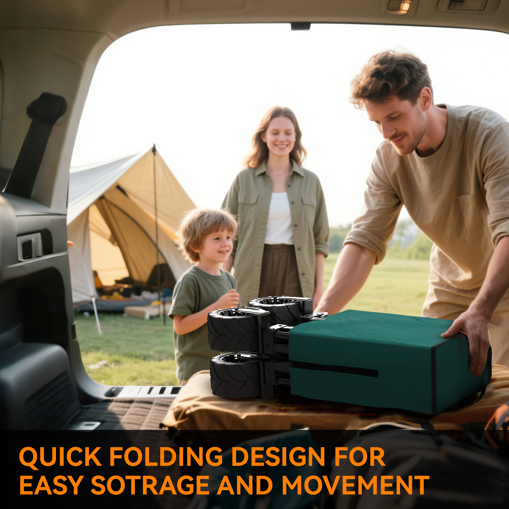 - Four wheels, two of which rotate around fully, to move the cart around on sand and solid ground