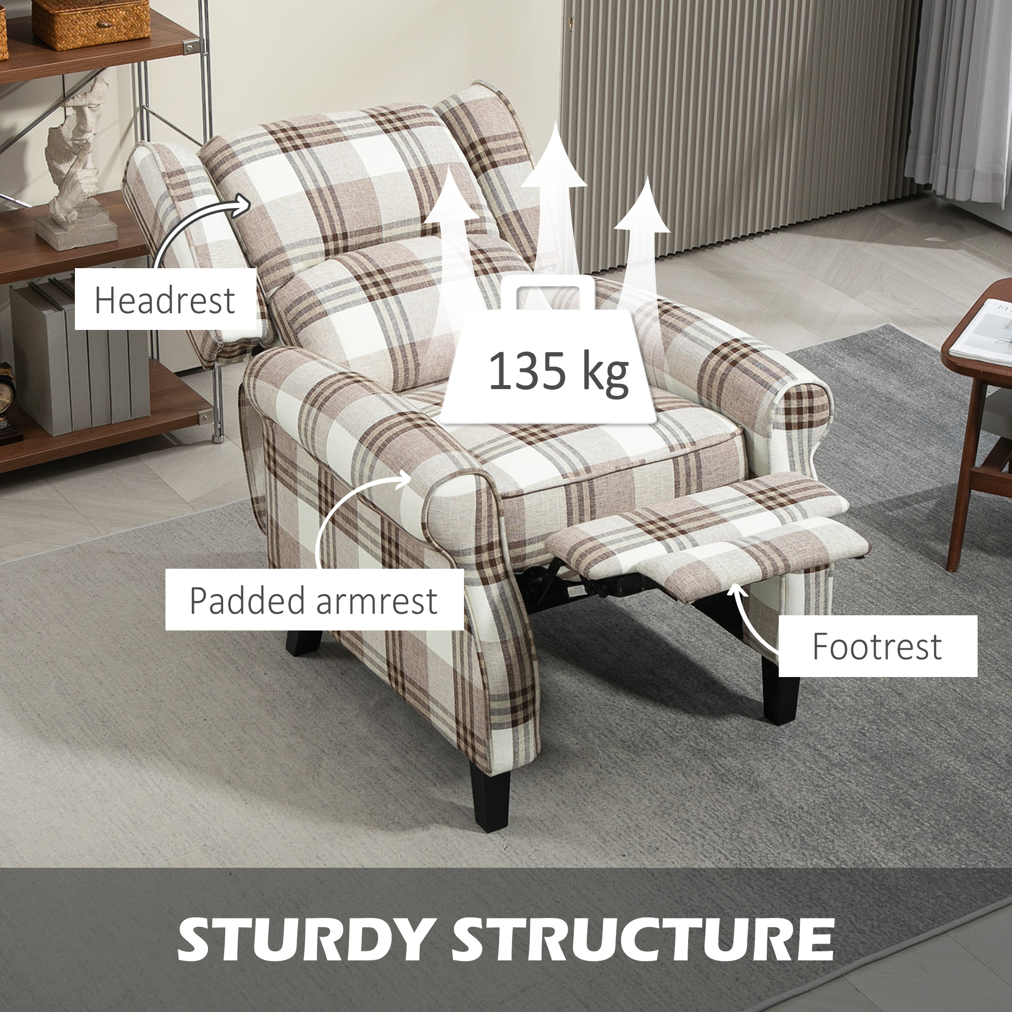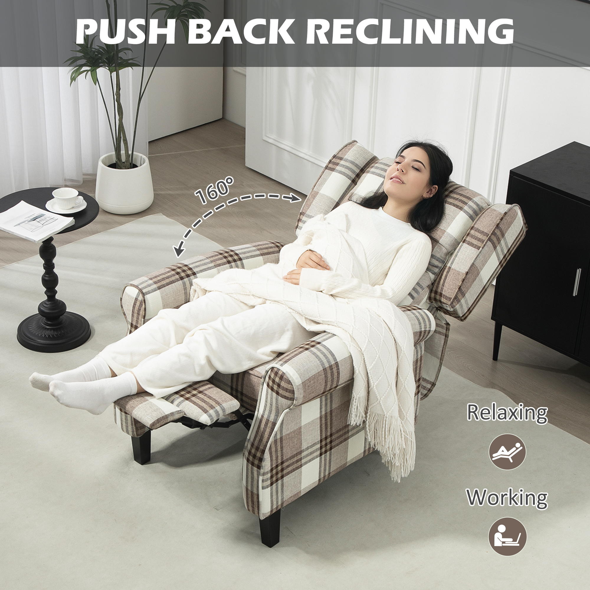 Smart, stylish and oh so comfortable – invite this HOMCOM recliner chair into your home and it will soon become a sure-fire winner everyone will be fighting to sit on. It's wrapped checked linen-feel upholstery: it's smooth and eye catching - a super combination. Set the back at any angle up to 160°: lie back to a position of your choice. Filled with sponge, the comfy chair for living room is very comfortable, with the thick padded back offering support.