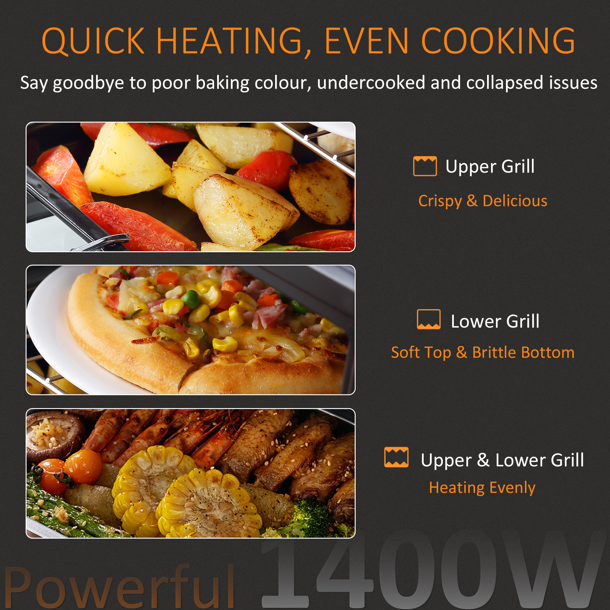 Whatever the space or size, it's easy to cook a wide variety of food with this HOMCOM countertop oven. Comes with a removable wire rack and cooking tray, with three different holding levels to reposition easily. The heat range, between 100°C and 230°C, means you can cook at different temps - no unneeded burnt food!