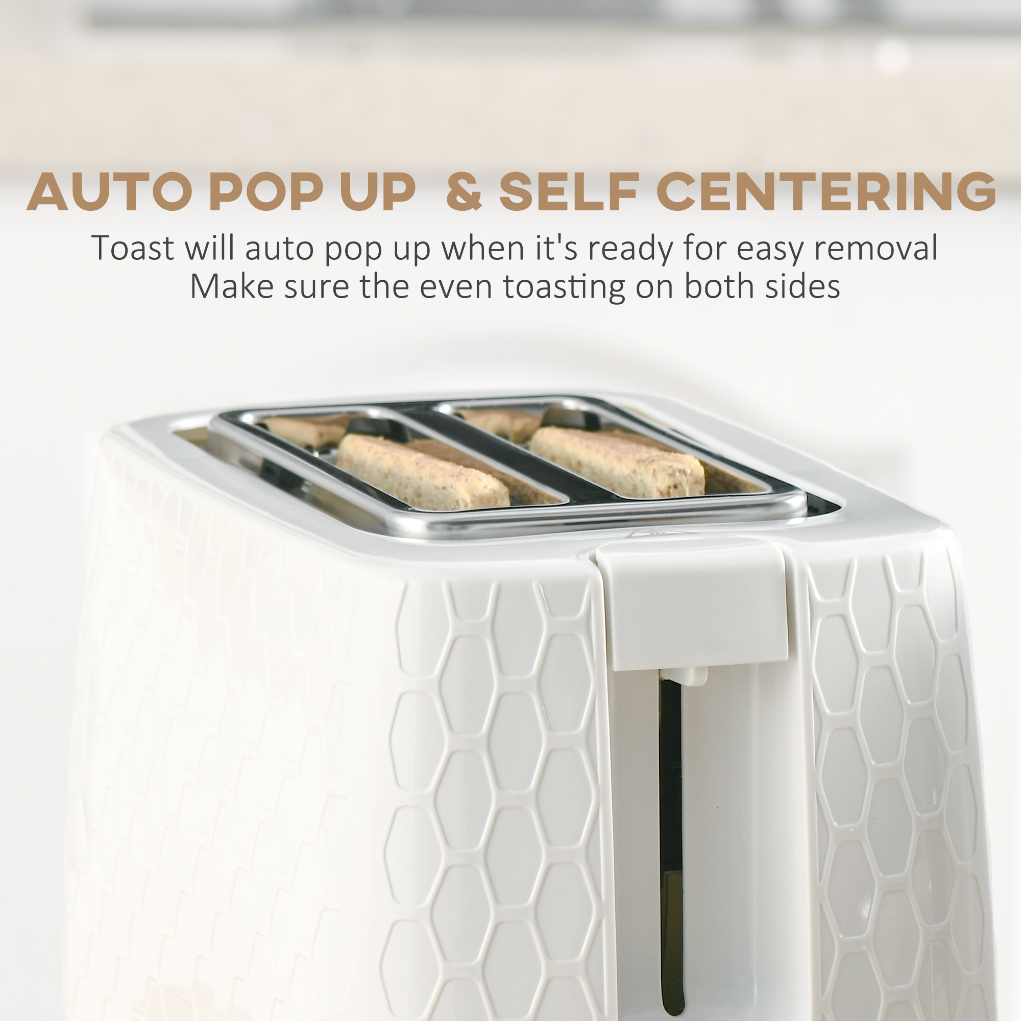 - Your toaster will automatically pop up when it's ready and auto-centring setting for even toasting result