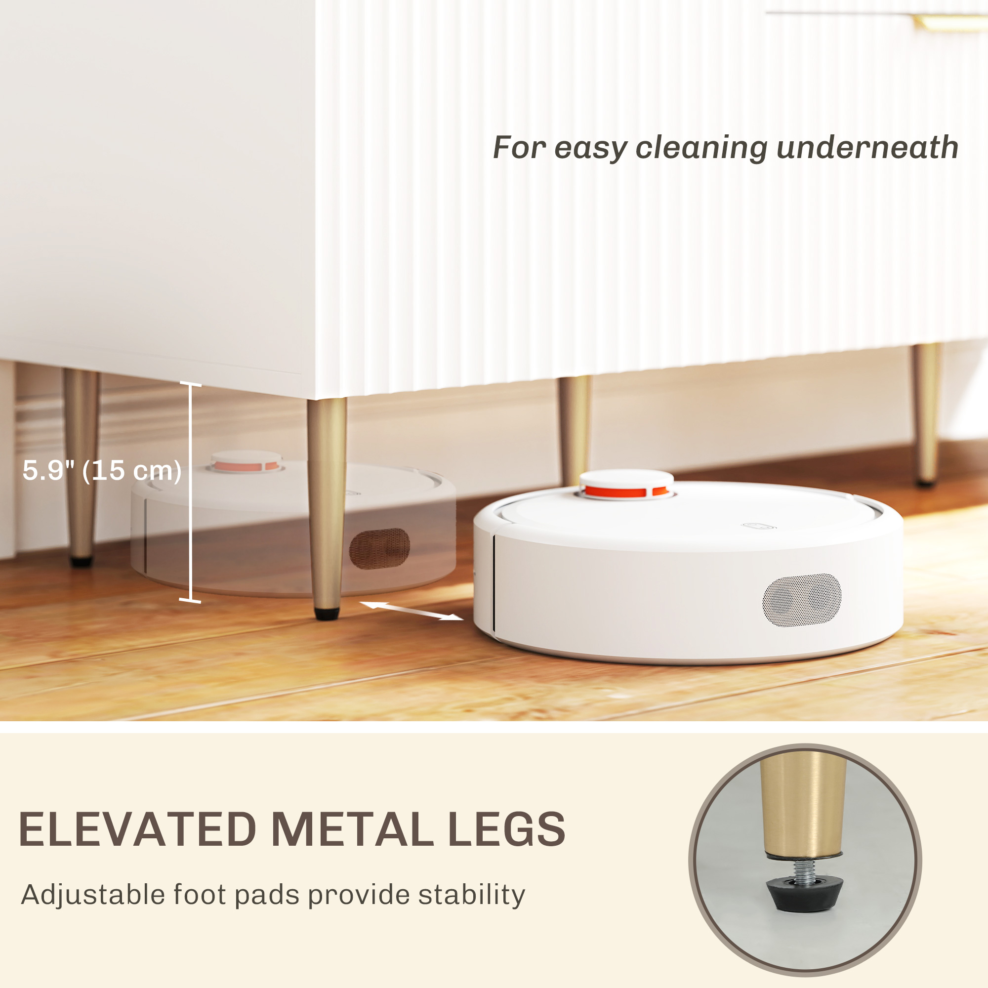 - Elevated metal legs allow for simple underneath cleaning