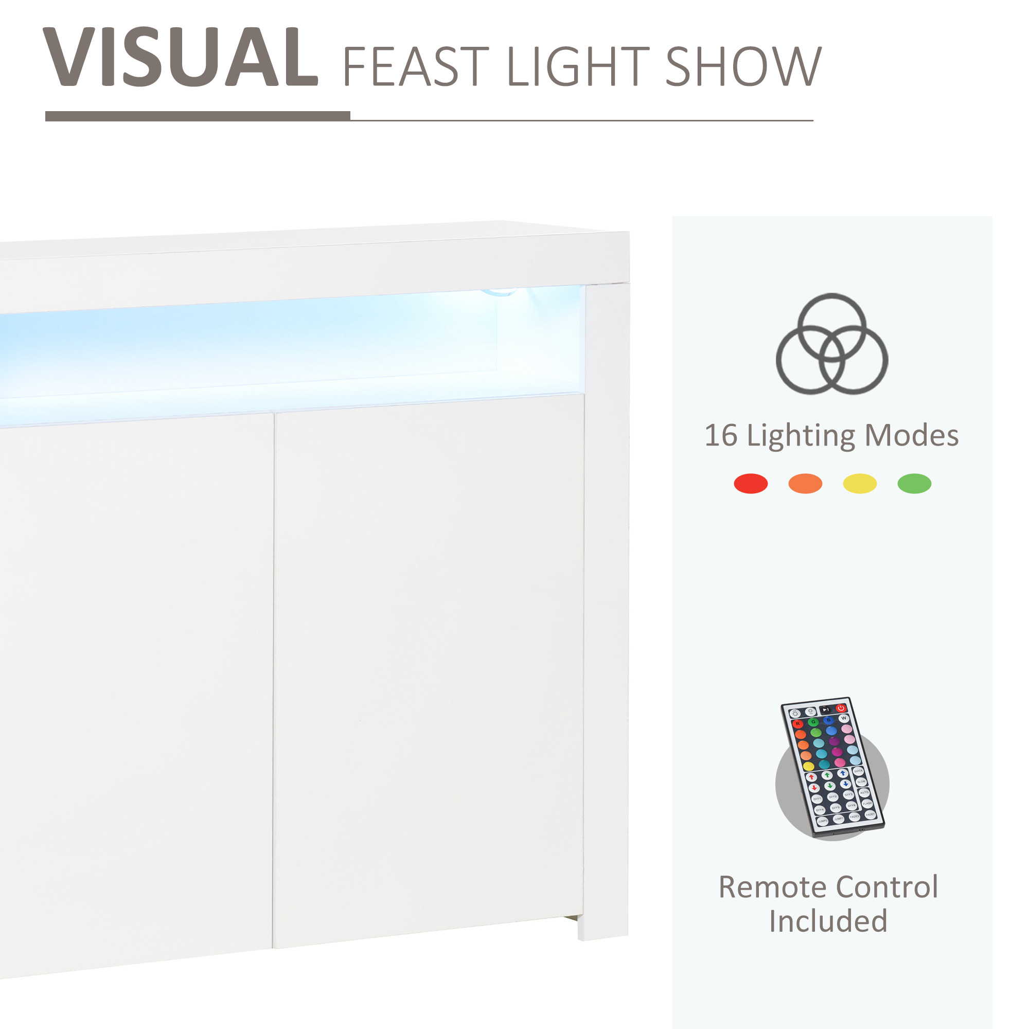 - Built-in RGB LED lighting trim changes between 16 different colours. Also controlled by remote