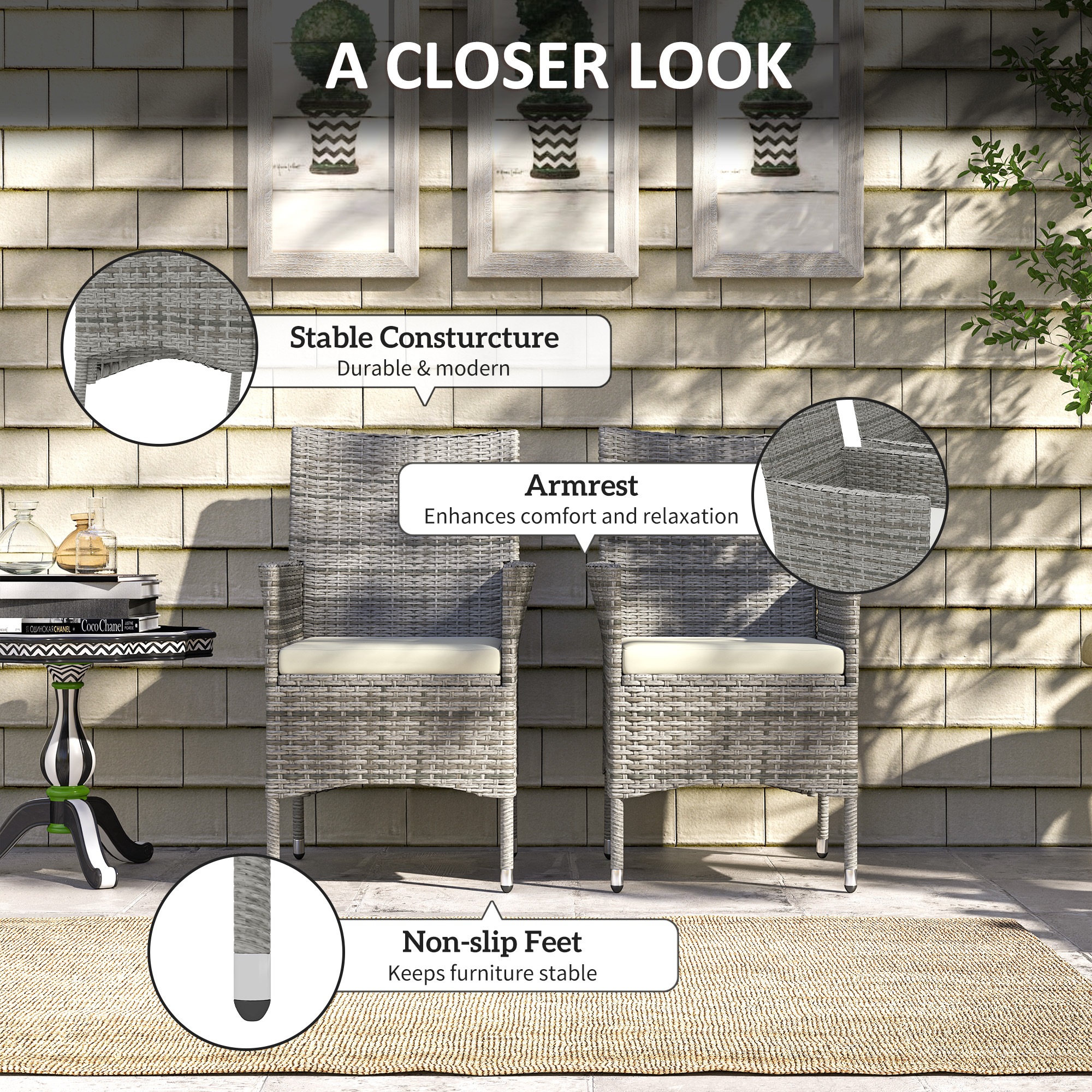 These two Outsunny rattan dining chairs are a great complement to your outdoors, whether standing alone or matched with other furniture. The garden dining chairs have a galvanised metal frame for a tough and fully supportive structure, wrapped in plastic rattan for durability and style. Tall backs and armrests for support, each chair has a cushion for comfort. Start the season the right way - start it with this stylish two-part set.