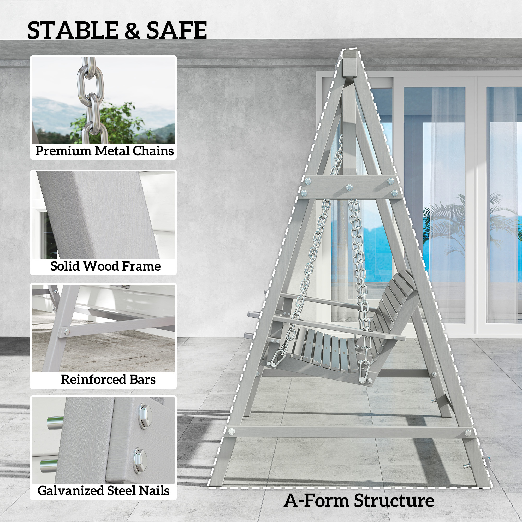 - Made from quality larch wood and galvanised steel chains