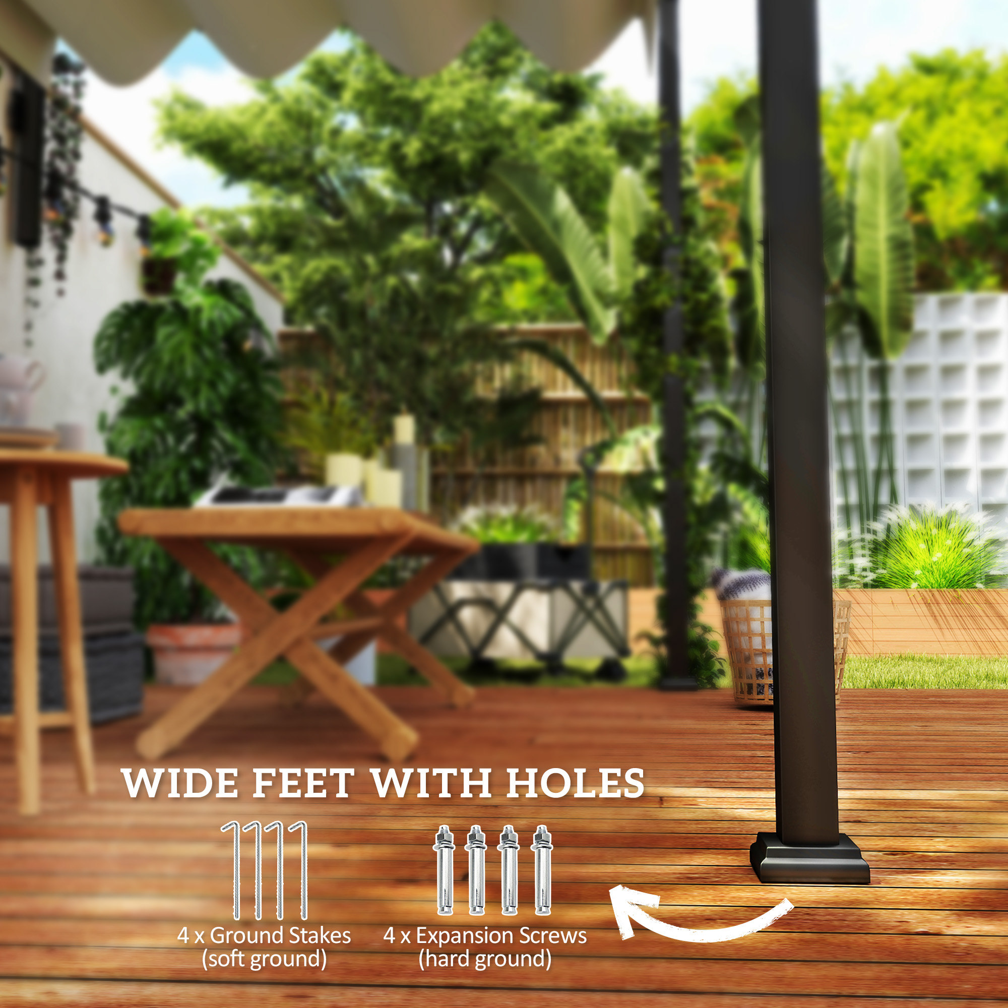 Be in control of how the sun shines around you. This Outsunny garden pergola comes with a retractable top canopy, so you can move it to any position you want. A powder coated steel frame for a robust structure, with the wall-less design creating an open and inviting atmosphere. 2 x 3(m) size means it is a spacious piece, great for bringing you and friends together. Set comes with four ground stakes, eight wall expansion screws and four ground expansion screws.
