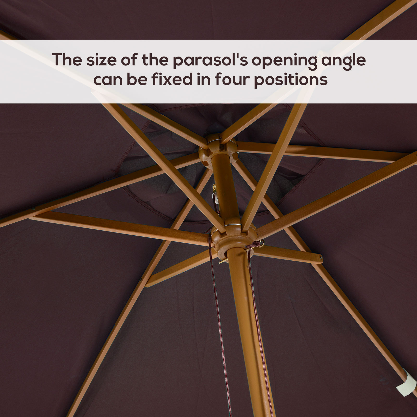 Stylishly make the most of the sun outdoors with this large garden umbrella from Outsunny. Built from wood, the main pole is extremely strong and stable and has been built to last for years to come. Made from 180g/㎡ polyester, the canopy will protect you from sunlight, UV and light rain, making it ideal for sitting out all day long. It's the ideal blend of beauty and functionality.