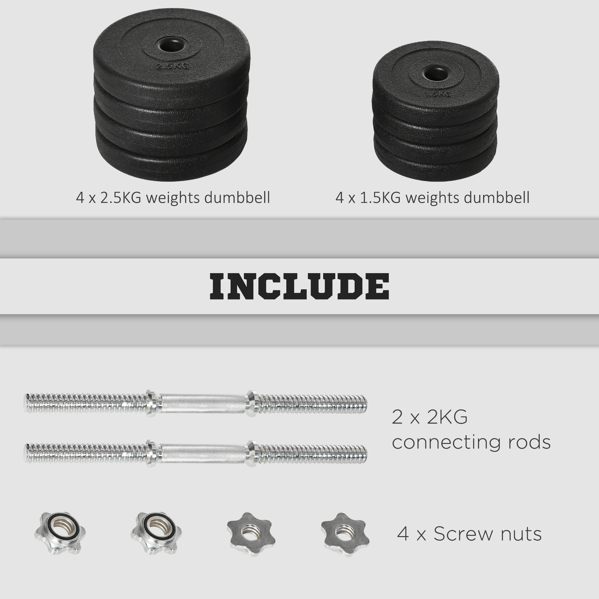 This dumbbell set comes with different weight plates and chrome finish bar, so it's easy to adjust to your most desirable weight. Comes with 4 x 2. 5kg and 4 x 1. 5kg weights, as well as 2 x 2kg connecting rods. You can easily exercise your arms, shoulders and back, strengthening your muscles and toning your body. It can be stacked together when not in use to save space. A gym weights set suitable for home and office use.