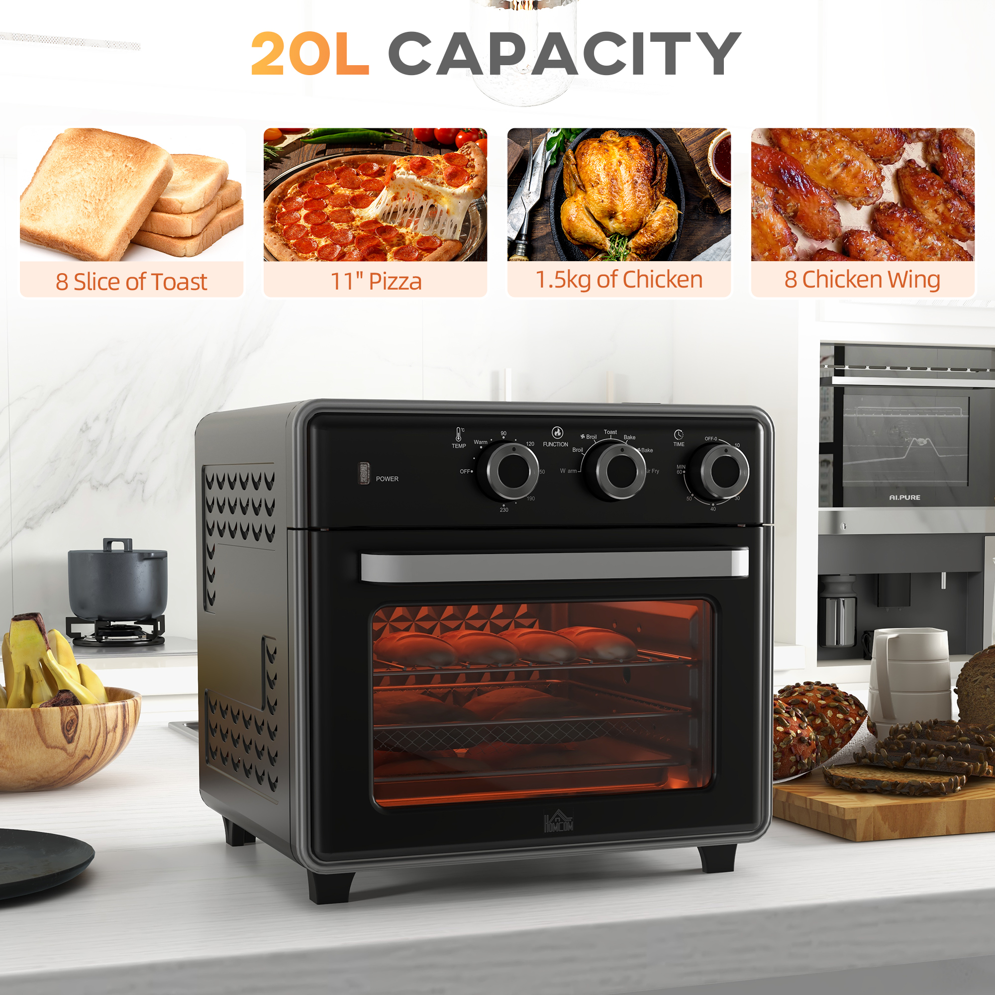 - 20 litre capacity size cooks 8 slices of toast, an 11" pizza or 8 chicken wings at a time