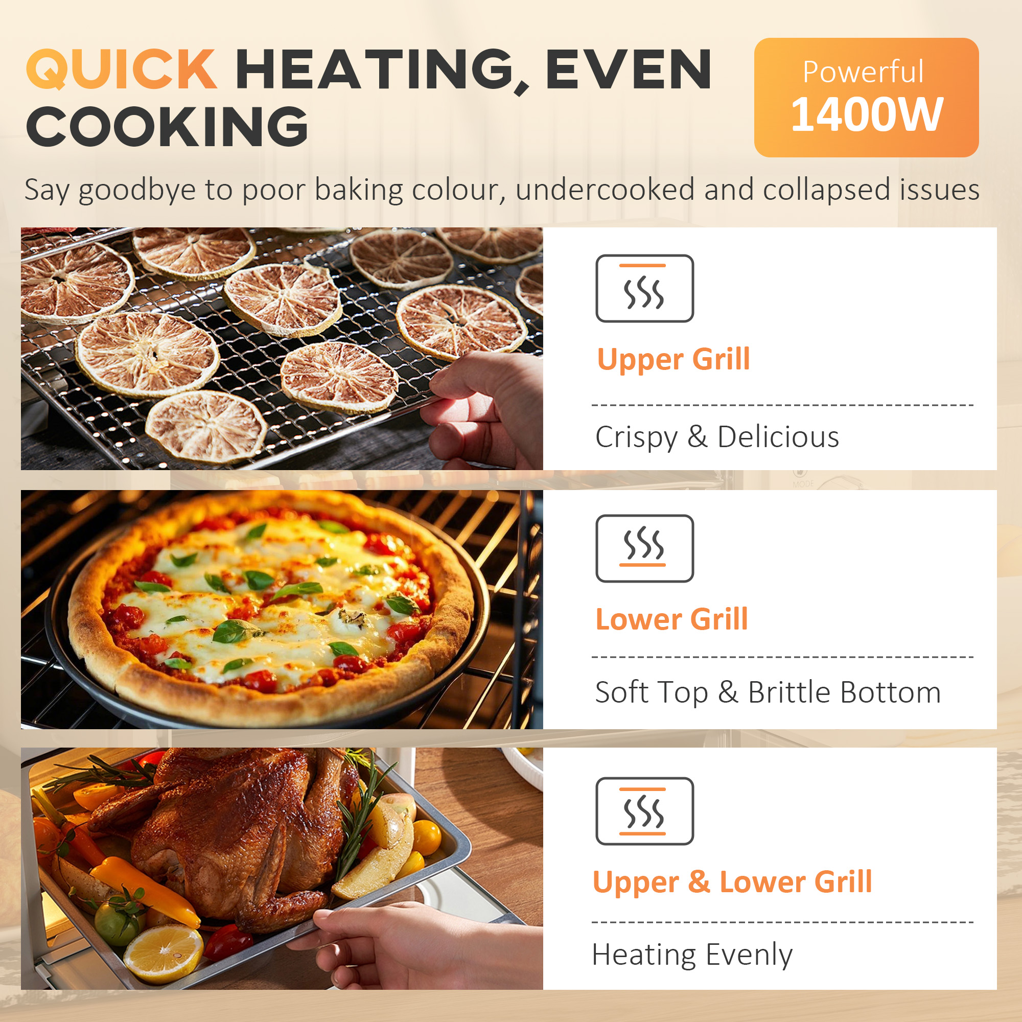 - Heat source can be changed between top, bottom, or both directions