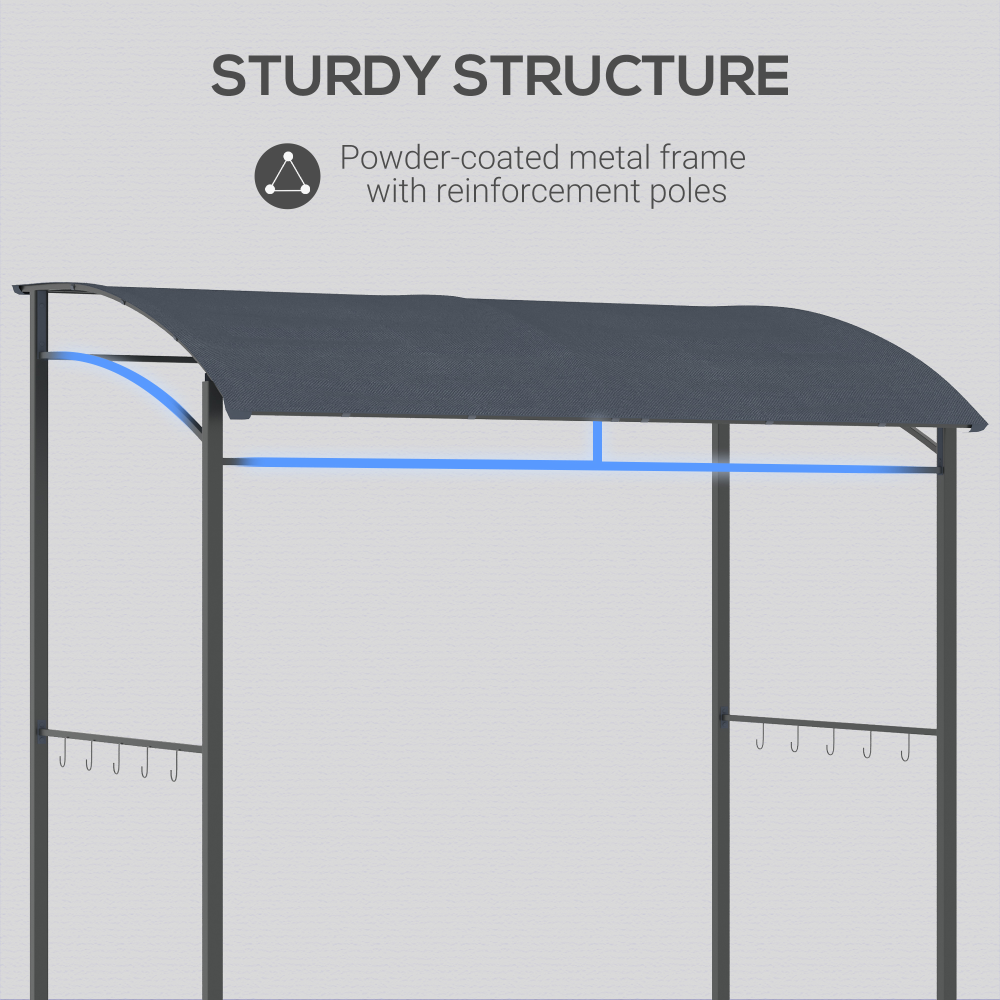Protective BBQ grilling all summer long with this Outsunny smoking shelter. The 215cm x 150cm metal frame gives you plenty of room to work; top canopy of bbq hut creates a safe shelter inside from rain above. Five hooks on each side provide handy holding space for utensils. The curved roof helps to prevent too much smoke build-up inside. Set comes with ground pegs to pin to the ground.