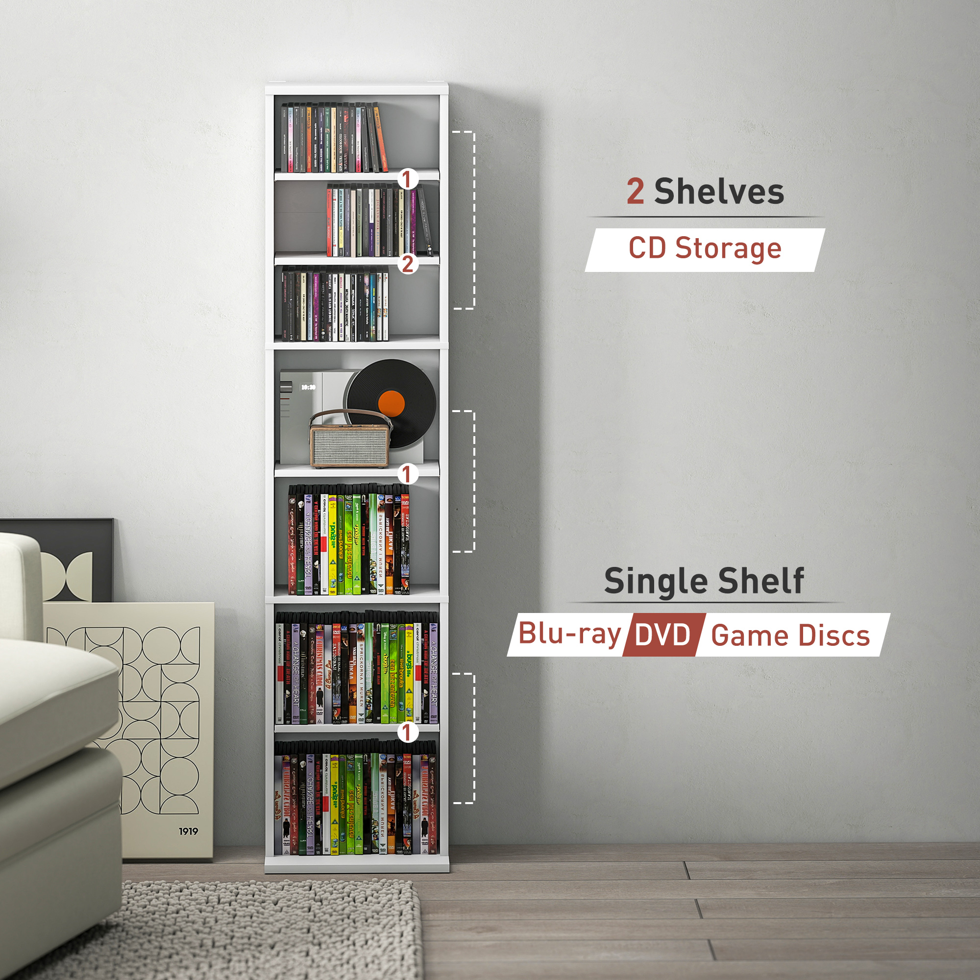 An easy and simple solution for keeping media stored, in the home and beyond - this HOMCOM storage unit. It holds up to 260 CDs, or 120 DVDs, with six adjustable shelves for customisable storage. The CD shelf is made from tough particle board with a smooth melamine coating, complete with anti-tipping straps included to secure to a wall.