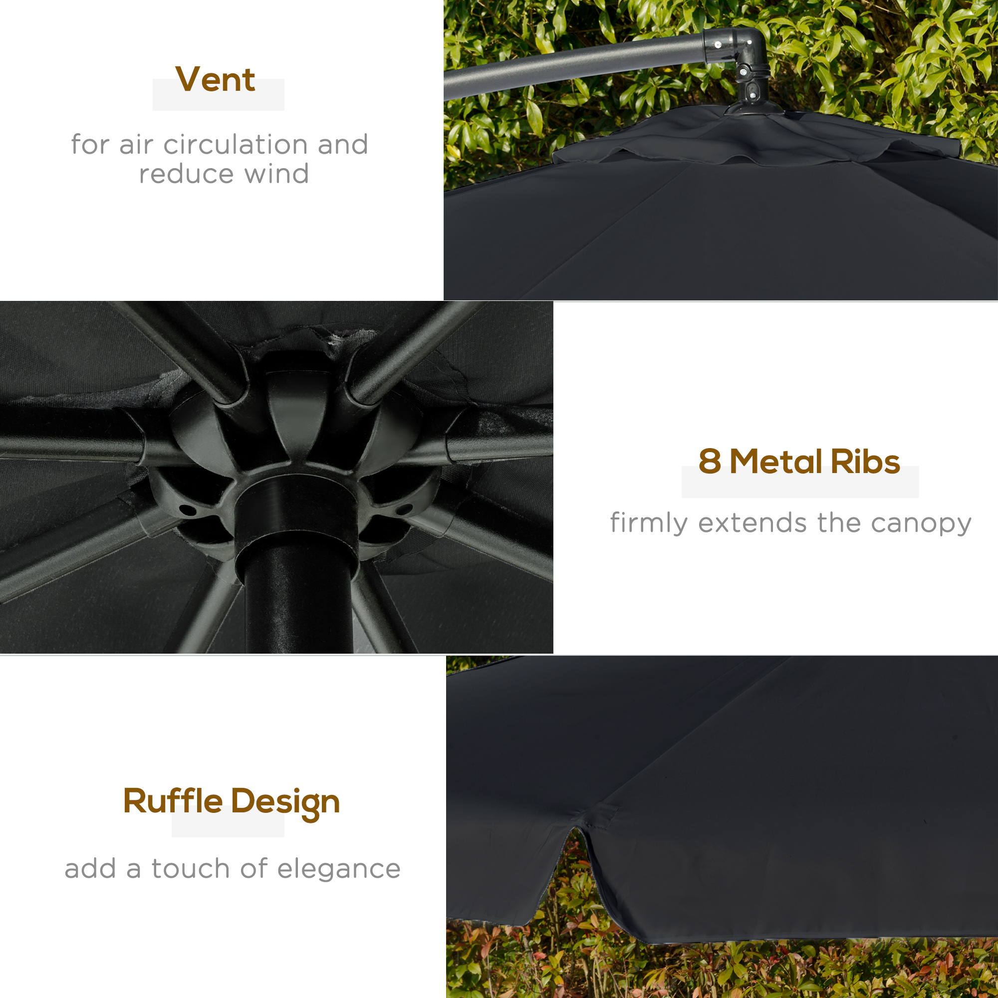 This Outsunny outdoor parasol is a piece you'll love having outside. The modern overhanging design means you can keep shaded anywhere, without the hassle of a central pole getting in your way. The core structure is made from metal, so it's tough and sturdy, connecting to the garden umbrella parasol with eight ribs for support. It can provide plenty of shade, keeping you cool on hot summer days but also bringing style into your garden and beyond.