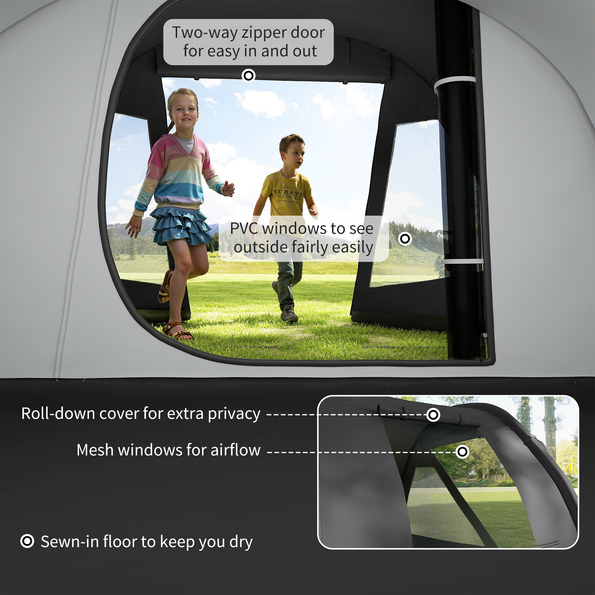 - Plastic windows for outside/inside views and mesh windows for ventilation, which come with covers for extra privacy