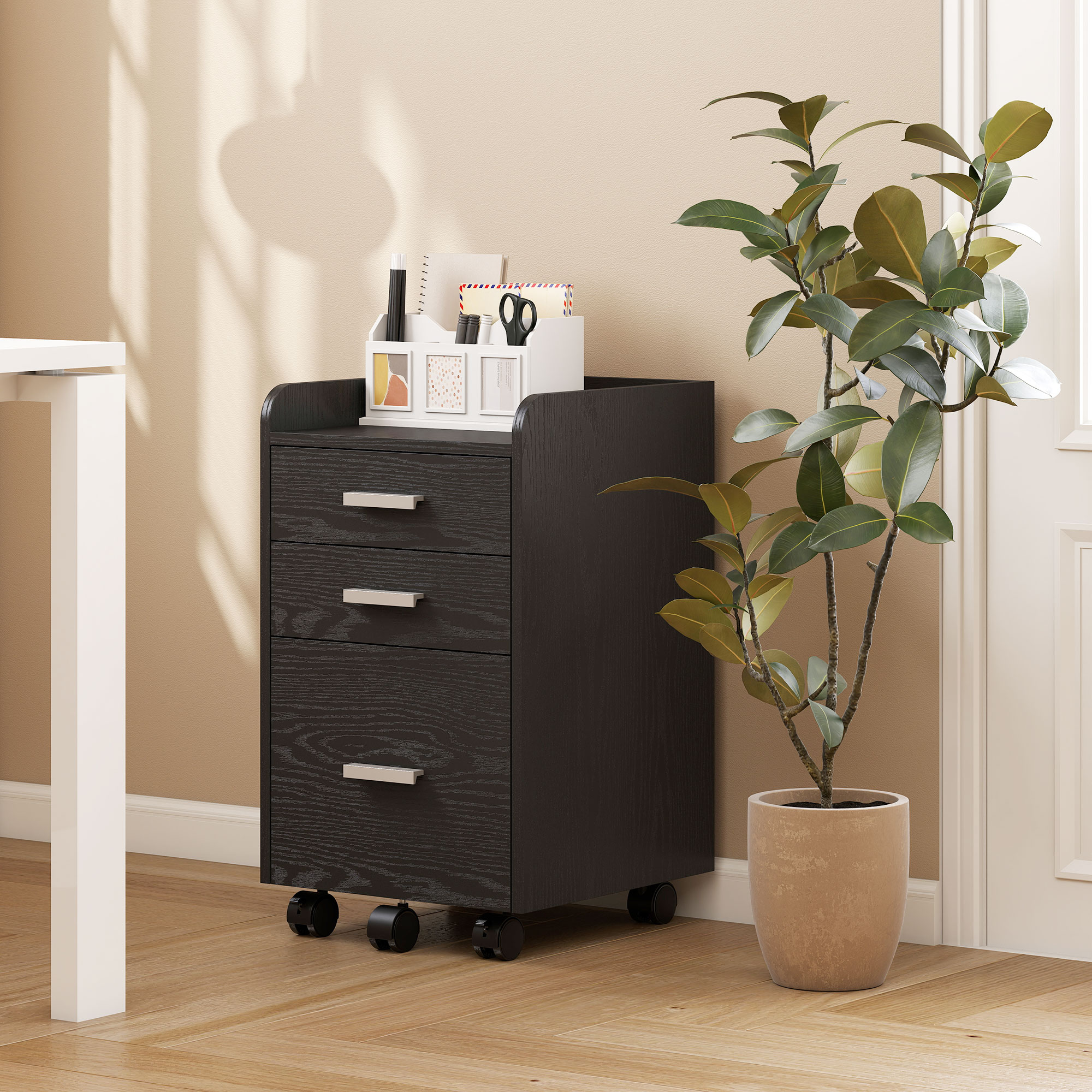 Keep workspace files tidy with this HOMCOM wood-effect filing cabinet. It has three drawers to hold papers, boxes, files and stationery. A compact size which slots under desks easily, it is complete with five wheels to move around easily - please two brakes for security. Robust MDF and particle board ensure durability for the file cabinet.