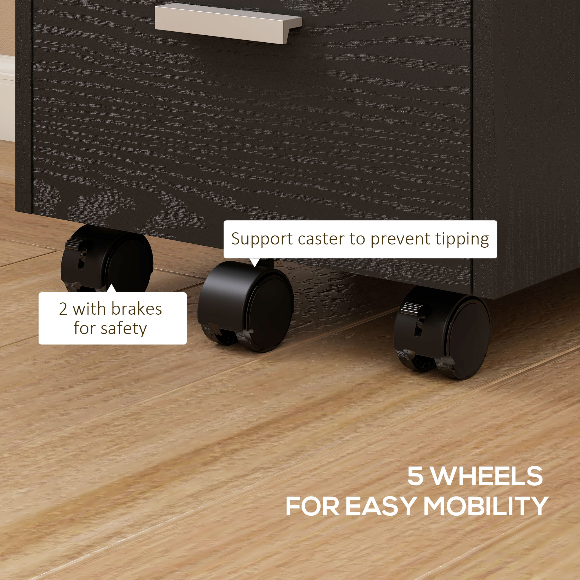 - Five wheels for easy movement, with two brakes and a middle caster for safety