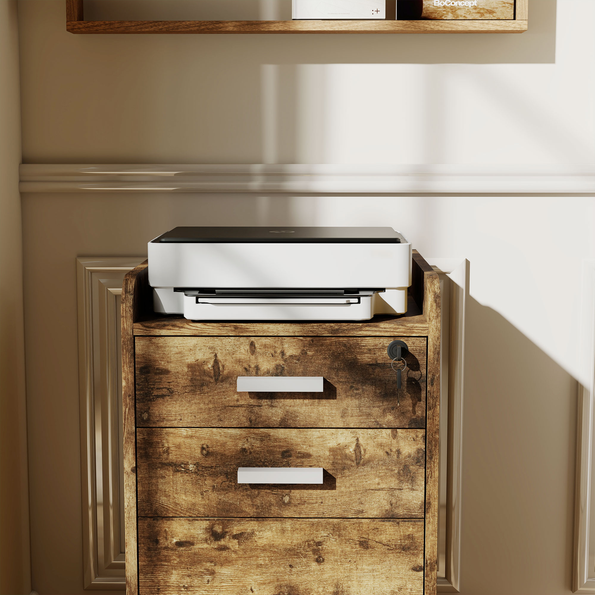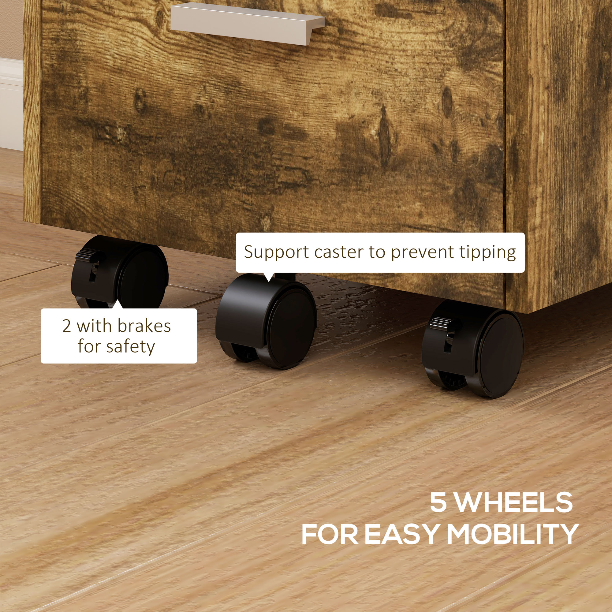 Keep workspace files tidy and secure with this HOMCOM wood-effect lockable filing cabinet. It has three drawers to hold papers, boxes, files and stationery, with a lockable top drawer for security. A compact size which slots under desks easily, it is complete with five wheels to move around easily - please two brakes for security.