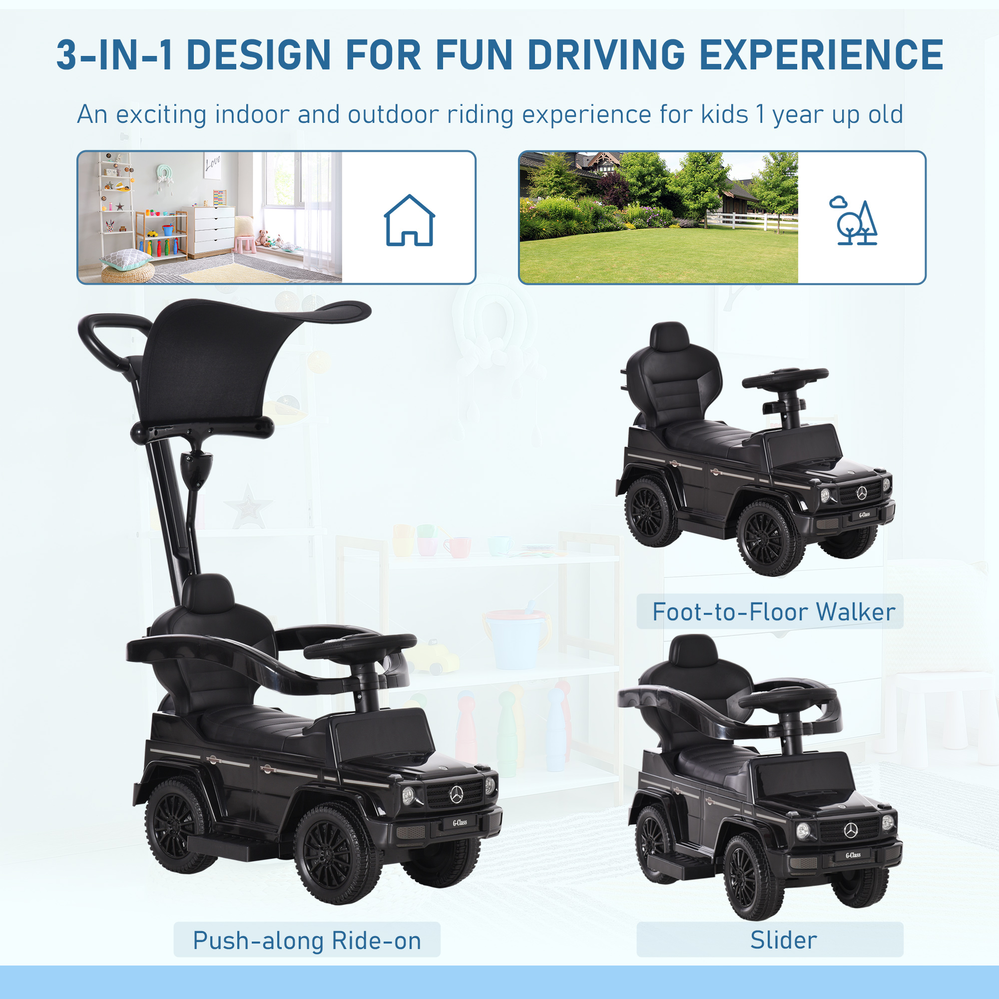 Your search for a fun sliding car stops here. Give children aged between 12-36 months this impressive piece from HOMCOM. Officially licensed Mercedes design adds to the extra fun. Features a moving steering wheel and horn. The seat with backrest is comfortable supportive, with the outer guardrail ensuring safety. Comes complete with a top canopy so they don't get burnt by the sun whilst cruising outdoors. 3-in-1 design: a walker, slider and push ride-on.