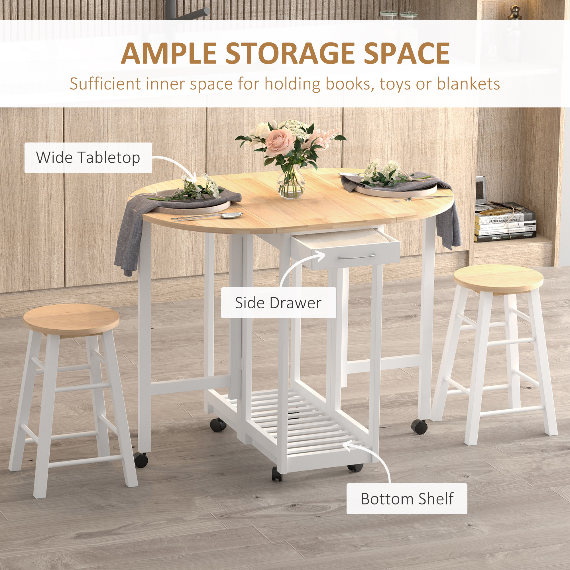This 3 piece counter height table chair set from HOMCOM offers you a great place to entertain your friends or family for a dinner or wine night in the comfort of your own indoor space. It features a table and 2 matching counter stools that tuck neatly underneath the table when not in use. Standing on 6 smooth rolling casters, this serving cart is easy to move from room to room. Suitable for a compact kitchen or dining room