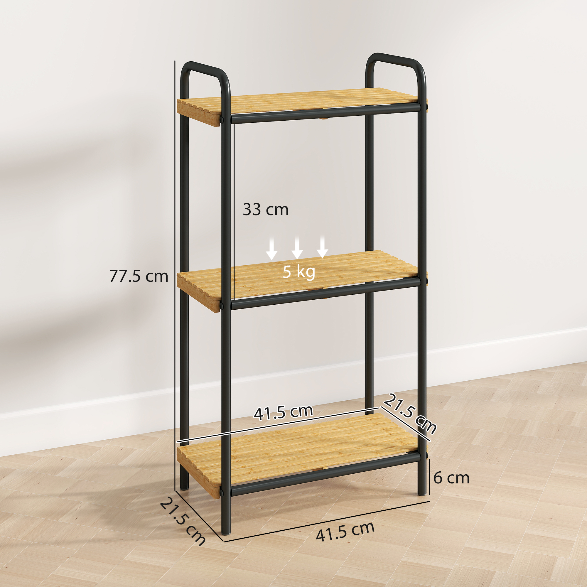 Transform your bathroom into a haven of safety and style with the HOMCOM freestanding bathroom shelf unit. Designed with anti-tip devices and a robust steel frame, it ensures peace of mind for families with little ones. Crafted from bamboo and steel with fresh varnish, it blends durability with natural aesthetics. Its three-tier slatted shelves offer lots of space to keep essentials organised and elevate your living experience.