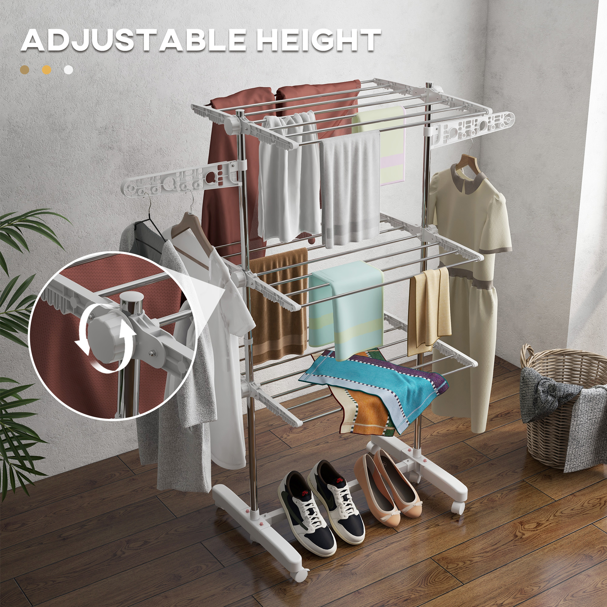 Easy clothes drying, with plenty of just-washed items thanks to this HOMCOM clothes horse. The multi-rack design comes with three middle shelves and two rotating wings: plenty of room for clothing. All levels, plus the legs, can be moved downwards/inwards to ensure it can be compactly stored. Six wheels to move it around easily, this laundry rack comes with two brakes so it stands stationary in place.