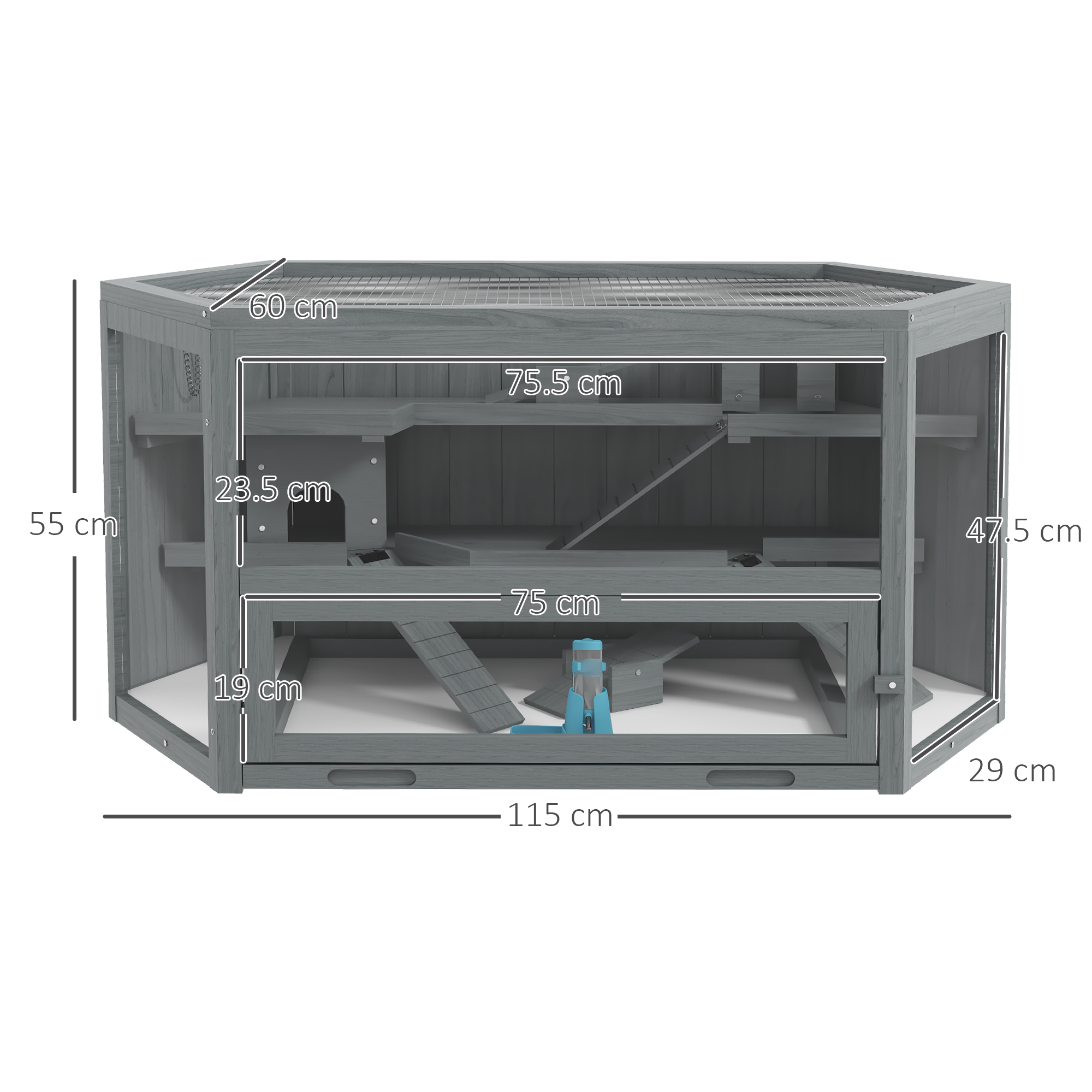 With three tiers, this PawHut dwarf hamster cage provides lots of space to roam, play and relax. Small pets will use the ramps to get around easily, whilst the tiny houses provide a place to rest in privacy. Its wooden frame is strong and solid – a reliable home, which can be used daily. With a hinged top, accessing and cleaning the cage is easy – it also keeps their area well ventilated. The raised base stops damp and moisture from seeping through; a cosy home for small pets to thrive.