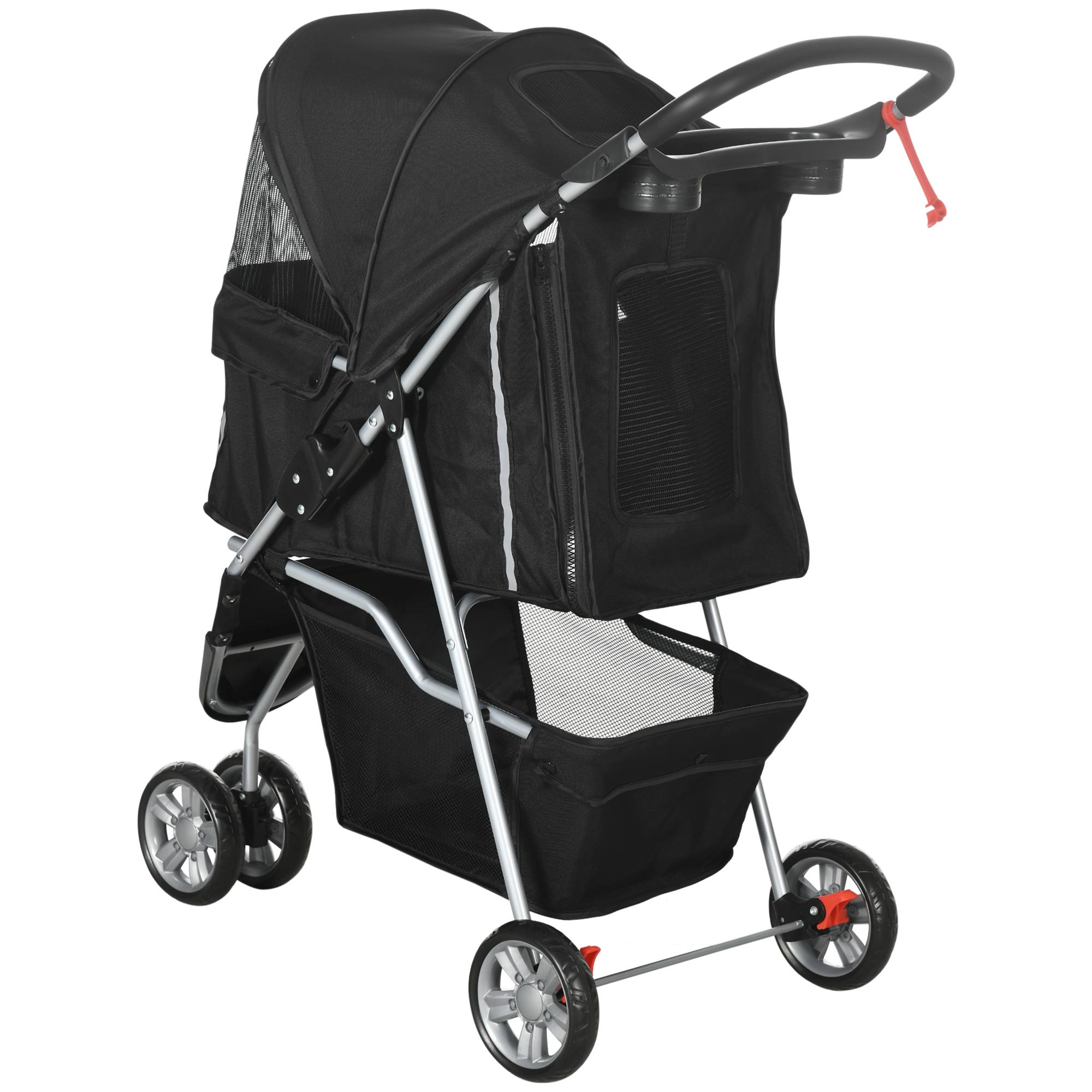 Long walks can be challenging for your pet, but now they're effortless with the PawHut dog pram. Your pet will relax in a comfortable, ventilated space with mesh panels for great airflow. Front universal wheels provide easy navigation, and brakes on the rear wheels for secure parking, so it won't roll away unexpectedly. Keep your drink in the cup holder and use the bottom basket for food, toys, bags and other essentials, letting you concentrate on enjoying the stroll.