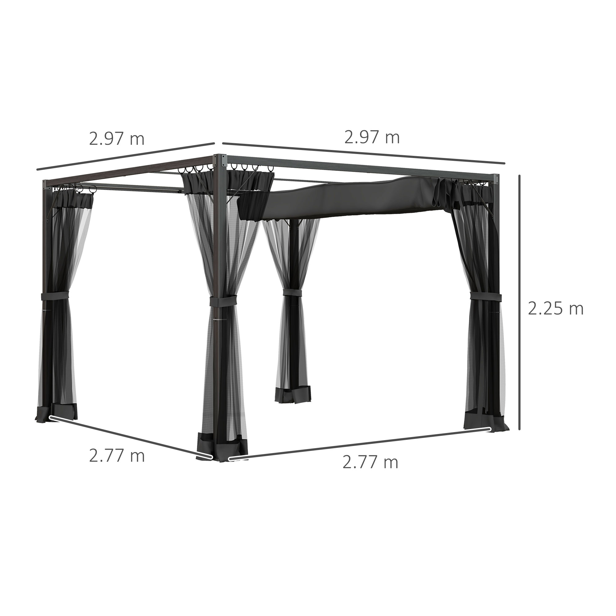 This Outsunny retractable pergola is a spacious outdoor shetler, which allows you to adjust the canopy as you desire - enjoy sunshine or relax in the shade. The aluminium structure is strong, with ground stakes and expansion screws included to keep it attached to the floor. Net curtains to protect inside from insects. Enjoy your outdoors better than ever before.