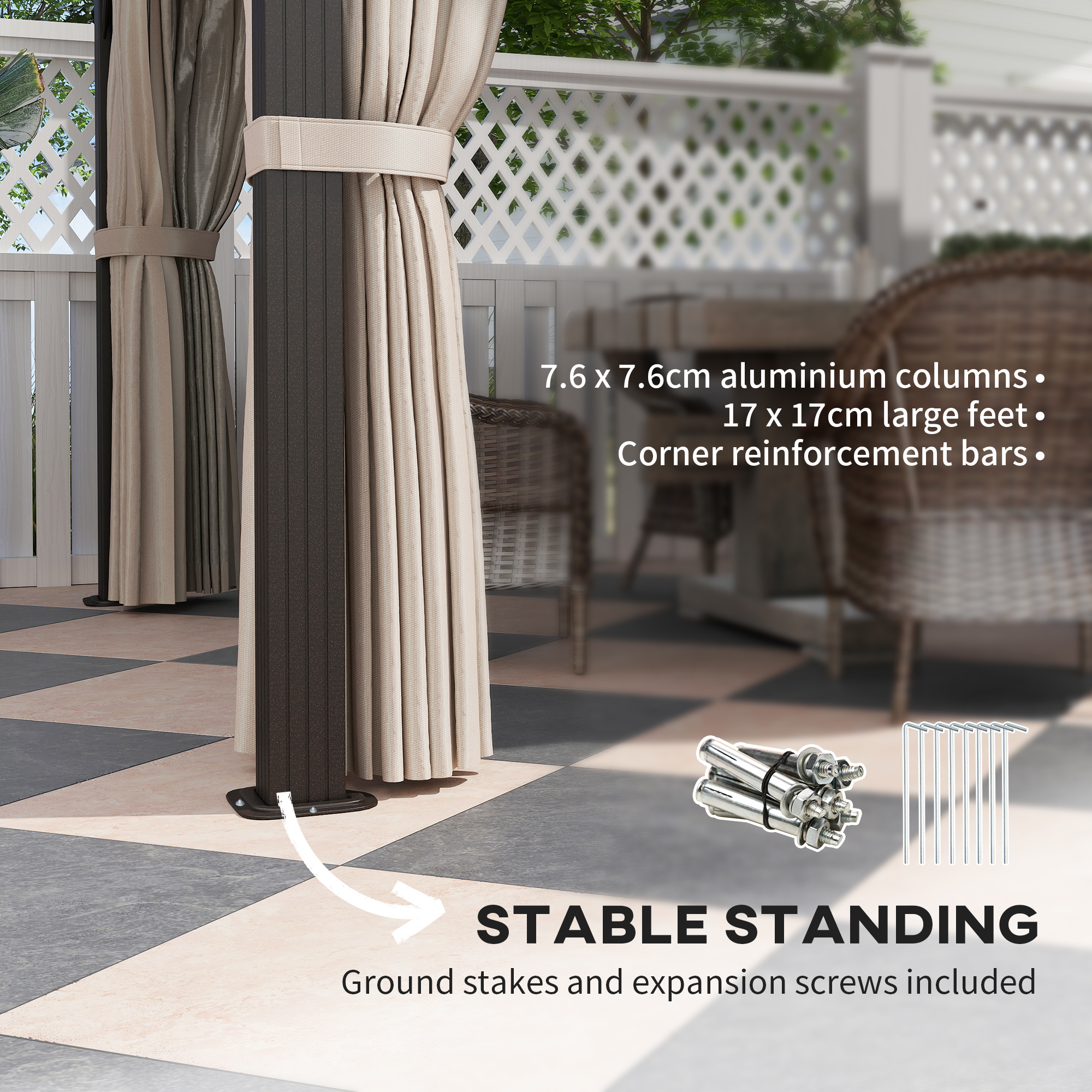 - 7. 6 x 7. 6 cm aluminium columns, 17 x 17 cm large feet and corner reinforcement bars for unmatched stability