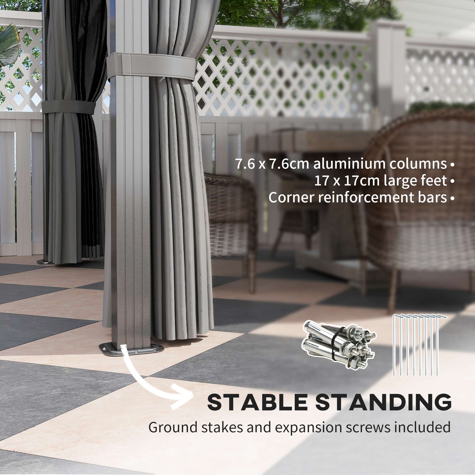 - 7. 6 x 7. 6cm aluminium columns, 17 x 17cm large feet and corner reinforcement bars for unmatched stability