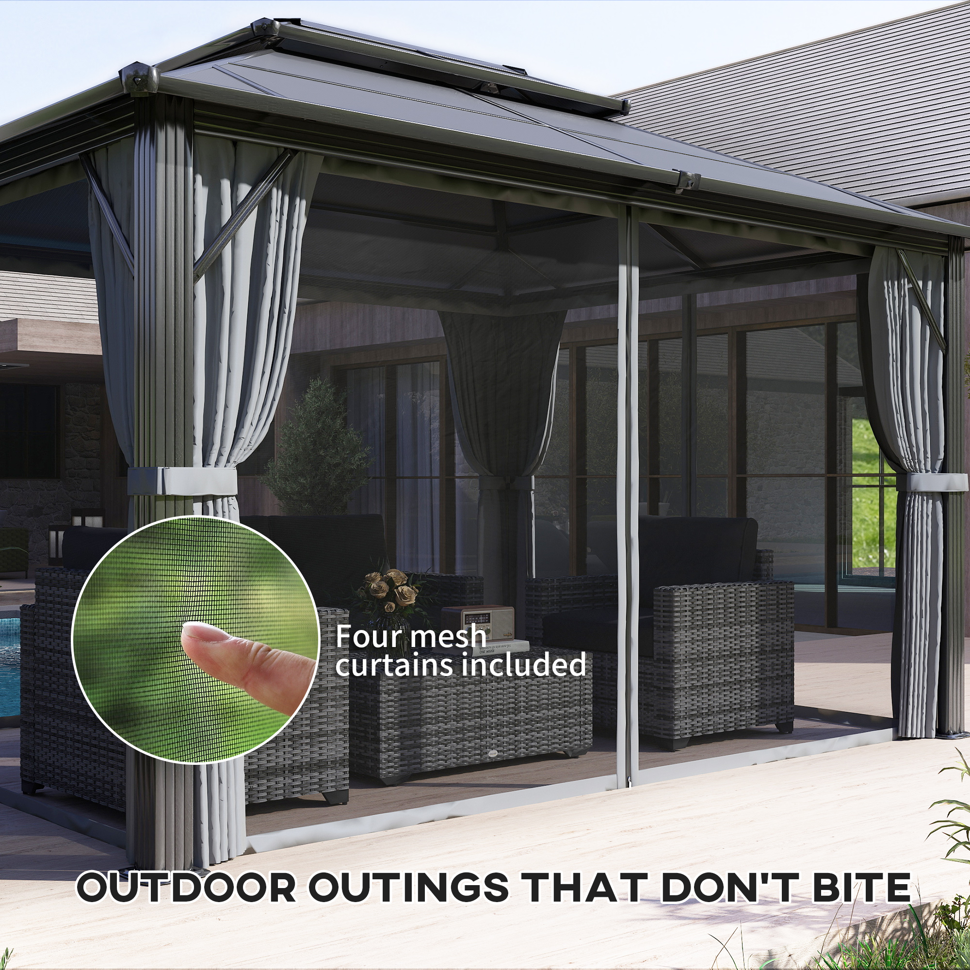 Transform your garden into a haven with the Outsunny polycarbonate gazebo. Featuring 6mm thick polycarbonate panels, this waterproof gazebo shields you from UV rays while keeping you cool with its clever two-tier airflow design. Stop the sun at any angle and get rid of unwanted winged guests with curtains and nettings. Enjoy a serene outdoor shelter with sides, great as a heavy-duty, permanent fixture for any patio.