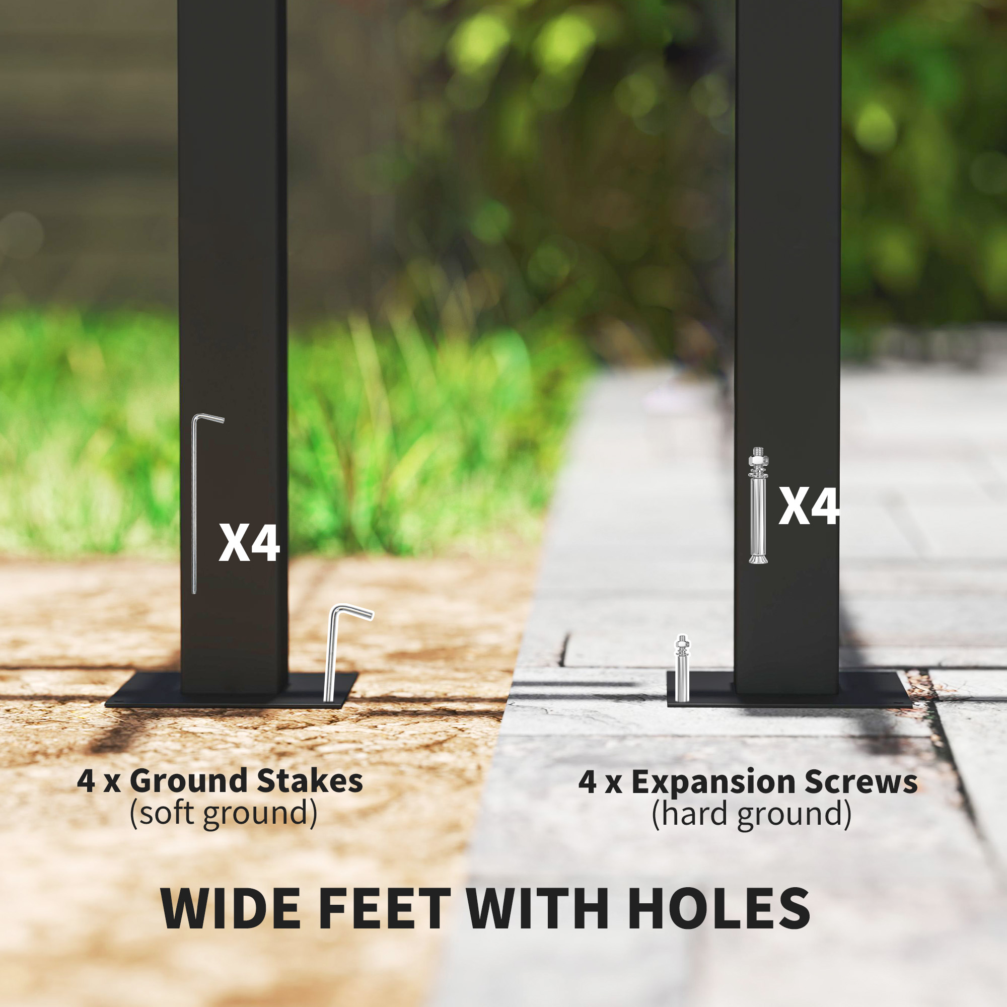 - Four ground stakes, eight wall expansion screws and four ground expansion screws included
