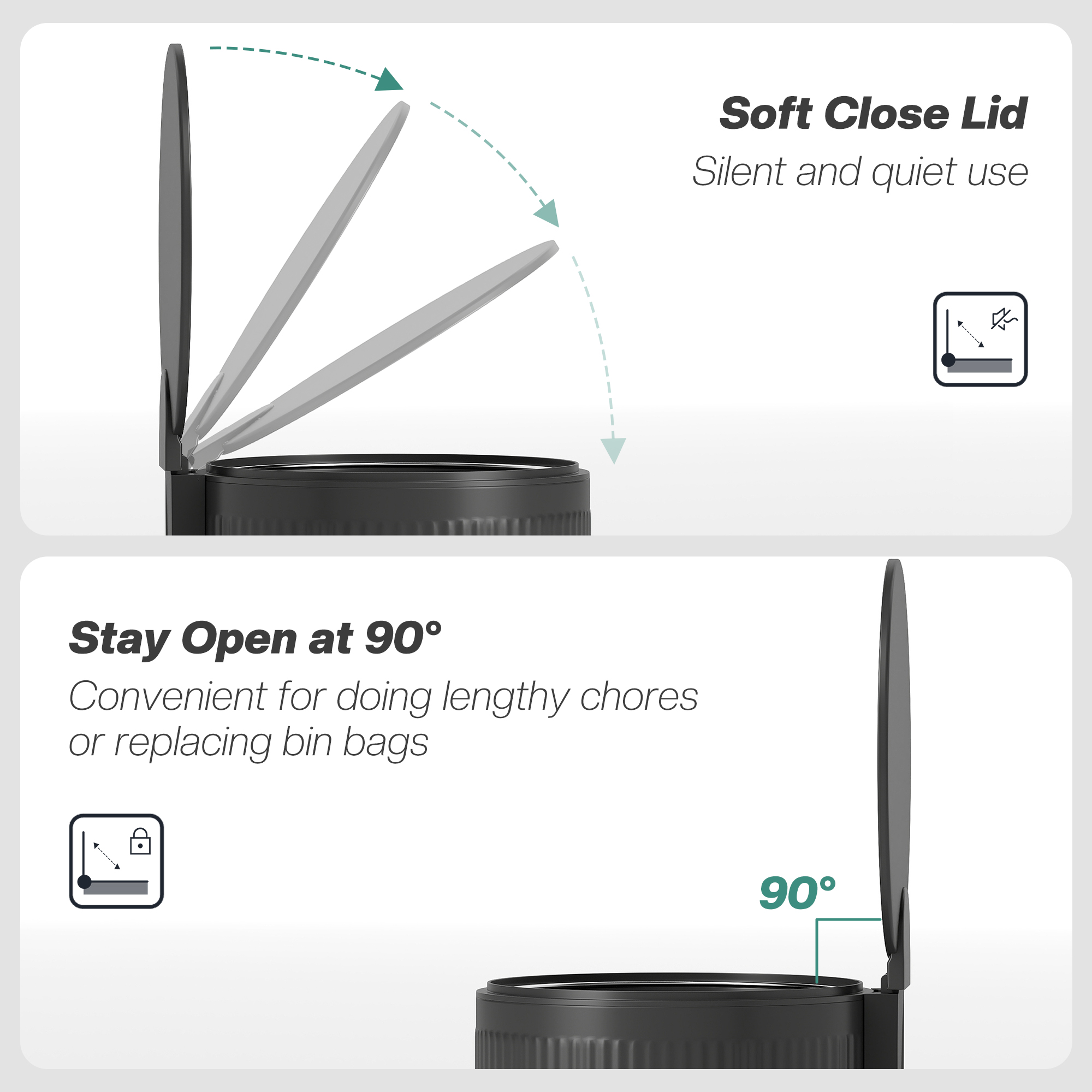 - The lid's stay-open feature allows for easy, hands-free disposal and bag changes