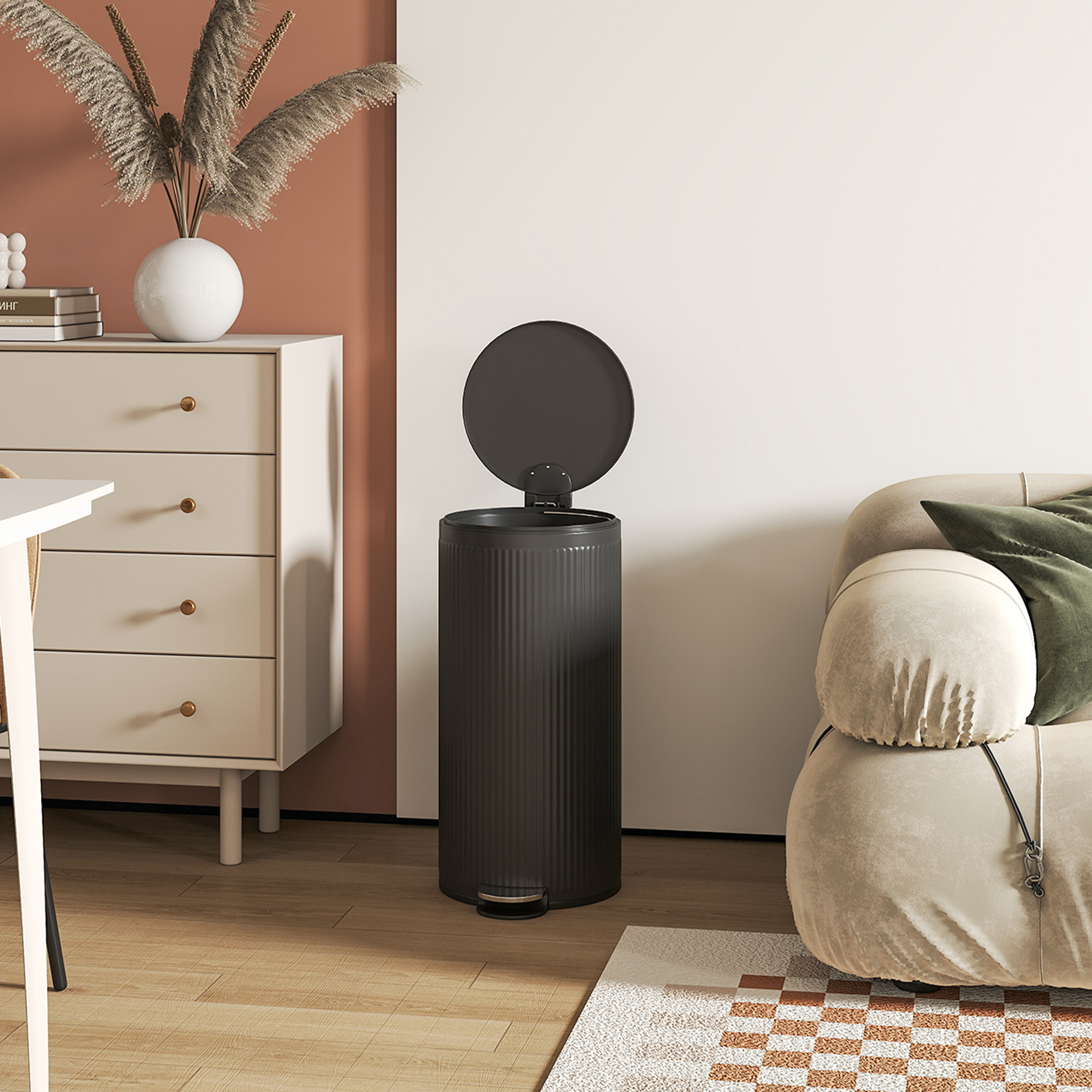 Struggling with a noisy, overflowing kitchen pedal bin that disrupts your home's calm and clashes with your decor? The constant bag changes and jarring lid slams can spoil a peaceful morning. The HOMCOM trash bin offers a solution. Its ribbed texture design fits any room, while the silent, soft-close lid preserves tranquility. The 30L liner means fewer trips to take out the trash, simplifying your daily routine and enhancing your living space.