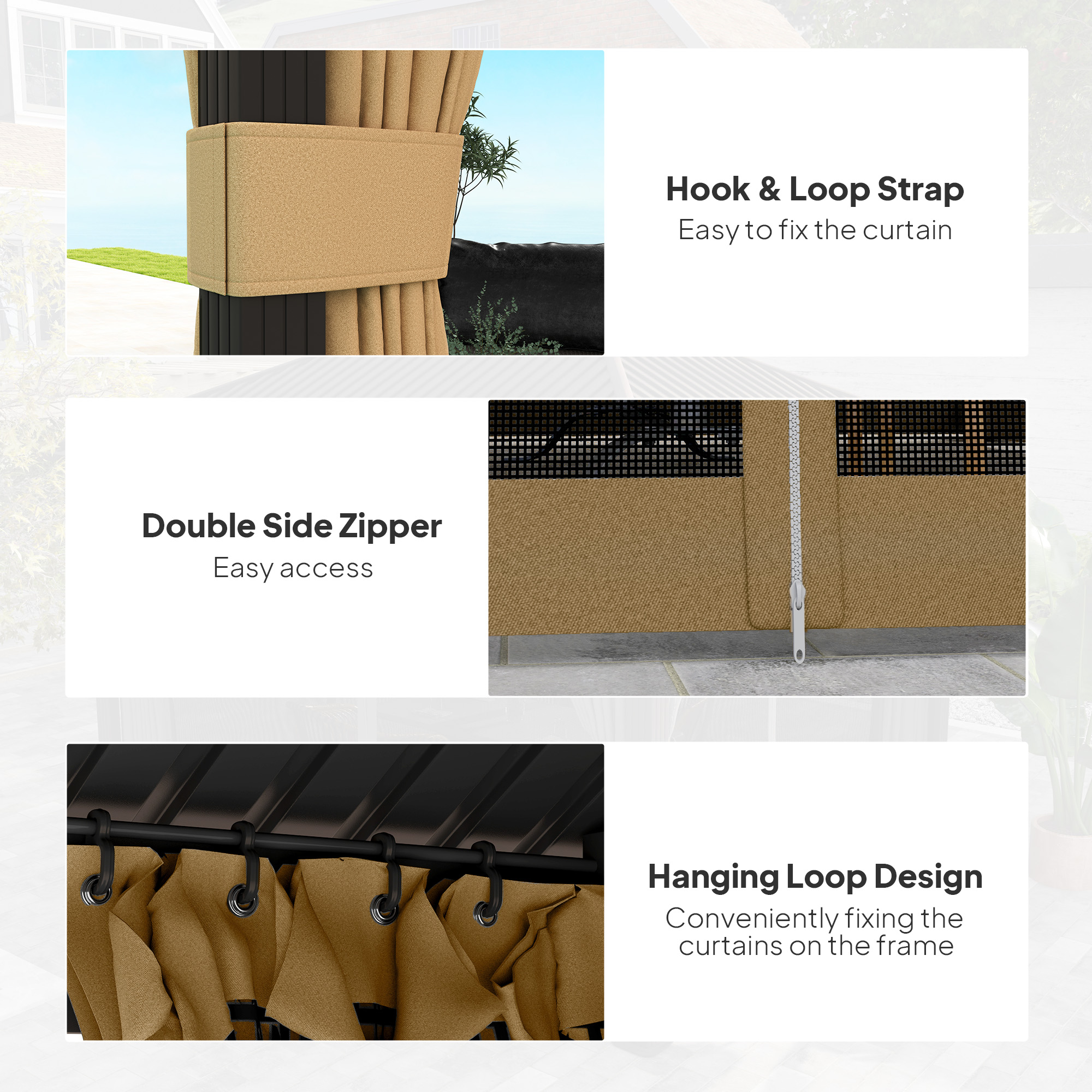 - Outer zipped curtain for privacy when needed, inner netting to protect against bugs etc.