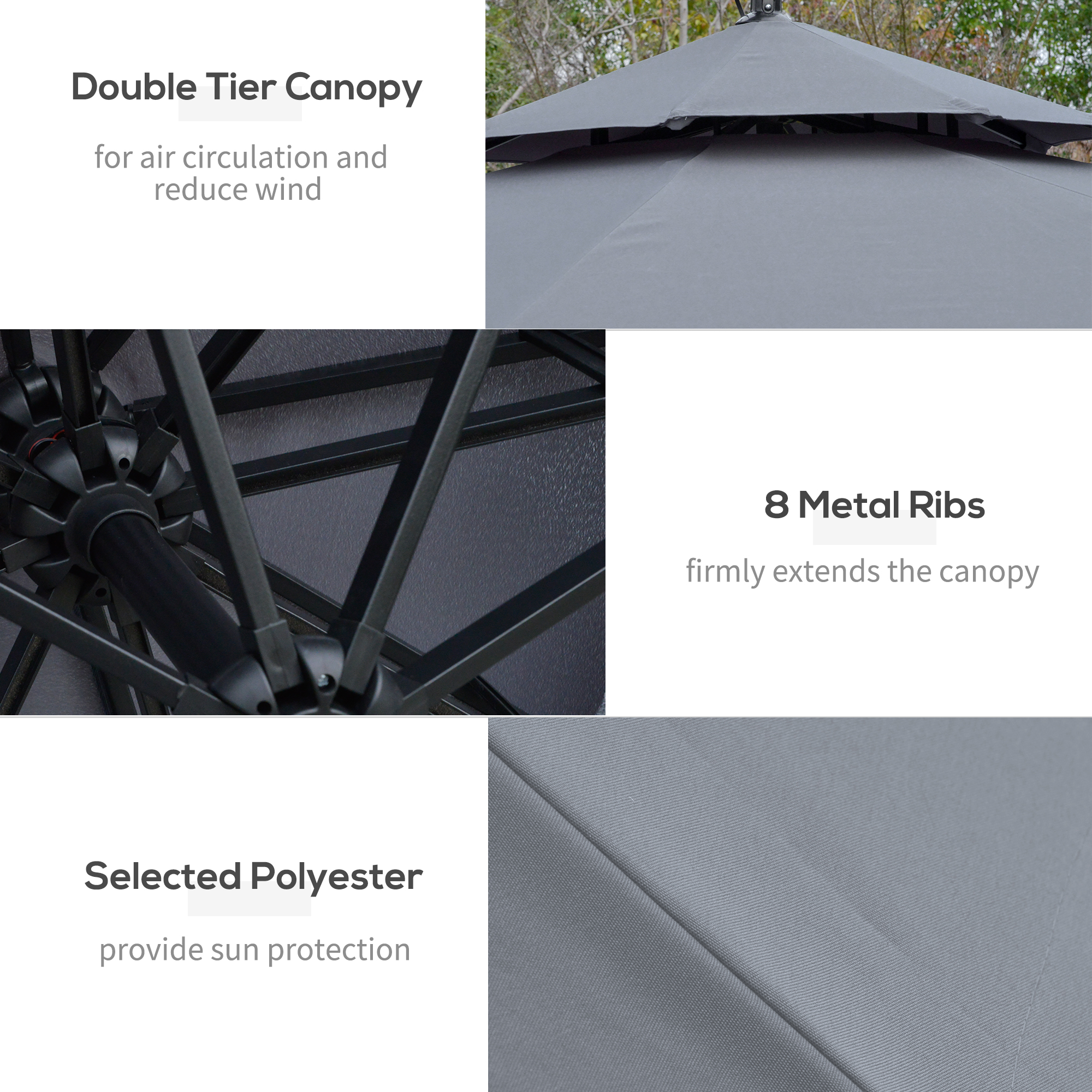 There's no better way to prolong the evenings this season: say hello to this Outsunny cantilever parasol with lights. The large overhanging design creates shade, without the pole getting in your way. It's fitted with solar-powered LED lights on the ribs, which charge in the day to illuminate at night - no electricity required. Use the crank handle to open/close the canopy easily, and adjust to a position you want. Cross base included - use Outsunny weights to complete.