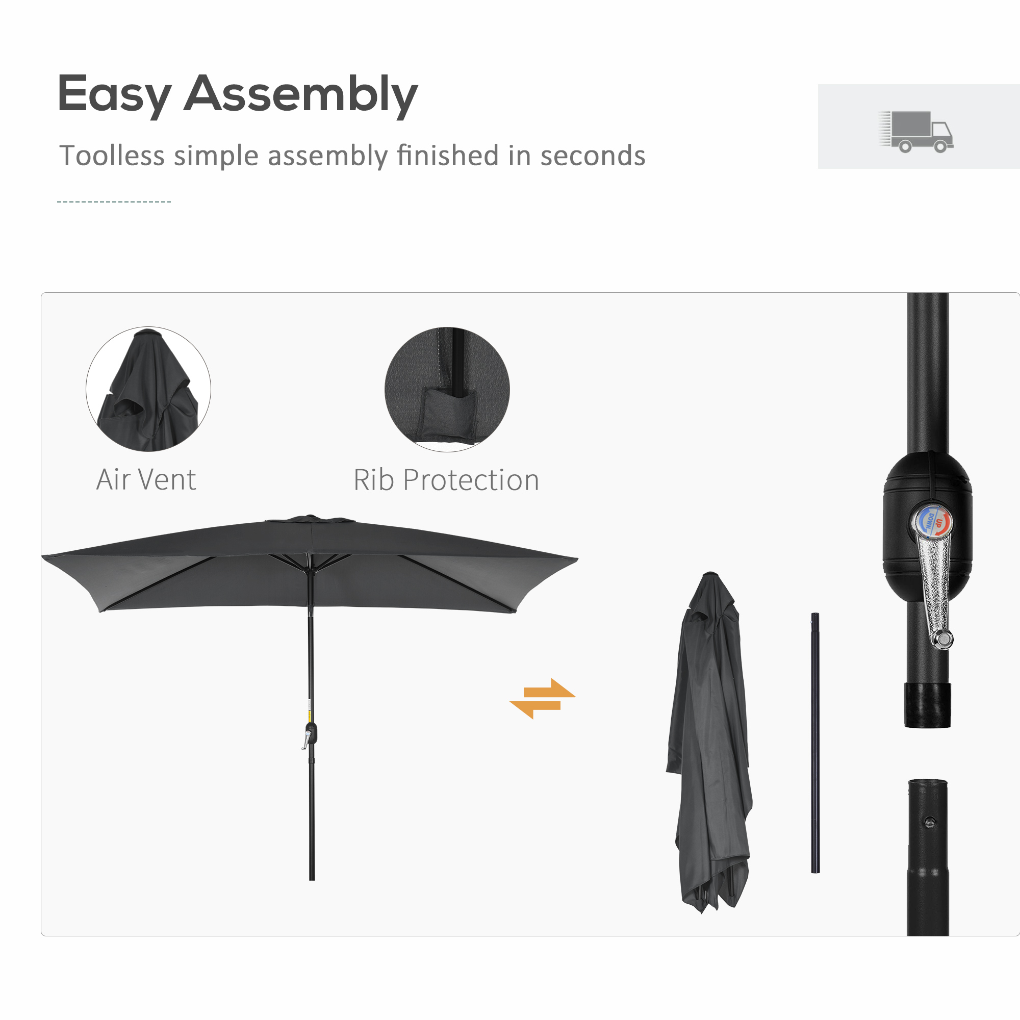 This Outsunny tilting parasol is an excellent choice for staying cool when sunny outside. The polyester canopy filters most UV rays, keeping you protected from potential sun damage, as well as helping to reduce sunstroke. It comes with a crank handle to open and close easily, as well as a button - adjusts the angle to cover the sun throughout the day. Note - base not included.