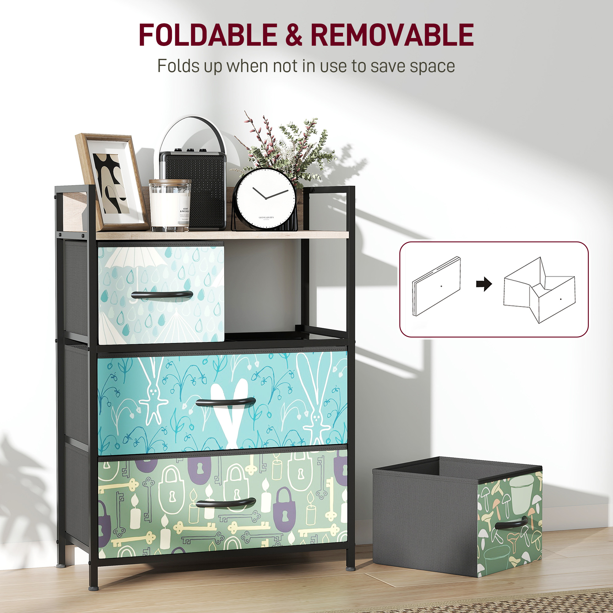 Adorned with exquisite patterns on each drawer panel, this bedroom drawers add a touch of elegance to any room. With four fabric drawers that are both removable and foldable, organising has never been easier. Great for bedrooms, living rooms, or home offices to keep your essentials tidy.