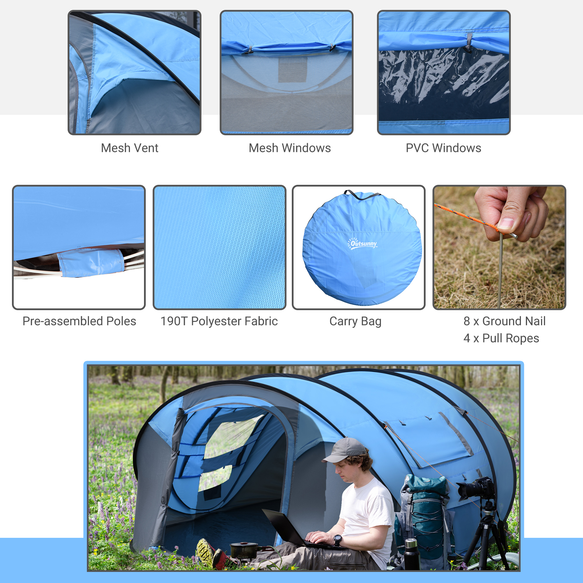 The Outsunny pop up tents for adults are perfect for day trips, overnighters and any beginner-level backpacking trips. It's big enough to house four people, making it suitable for family trips and adventures with friends - like festivals. The pop-up design makes our blackout tent easy to assemble and pack away, so less stress for you. Features two large doors for easy access and four mesh windows to keep you cool. And the lightweight tent comes complete with a bag to carry around.