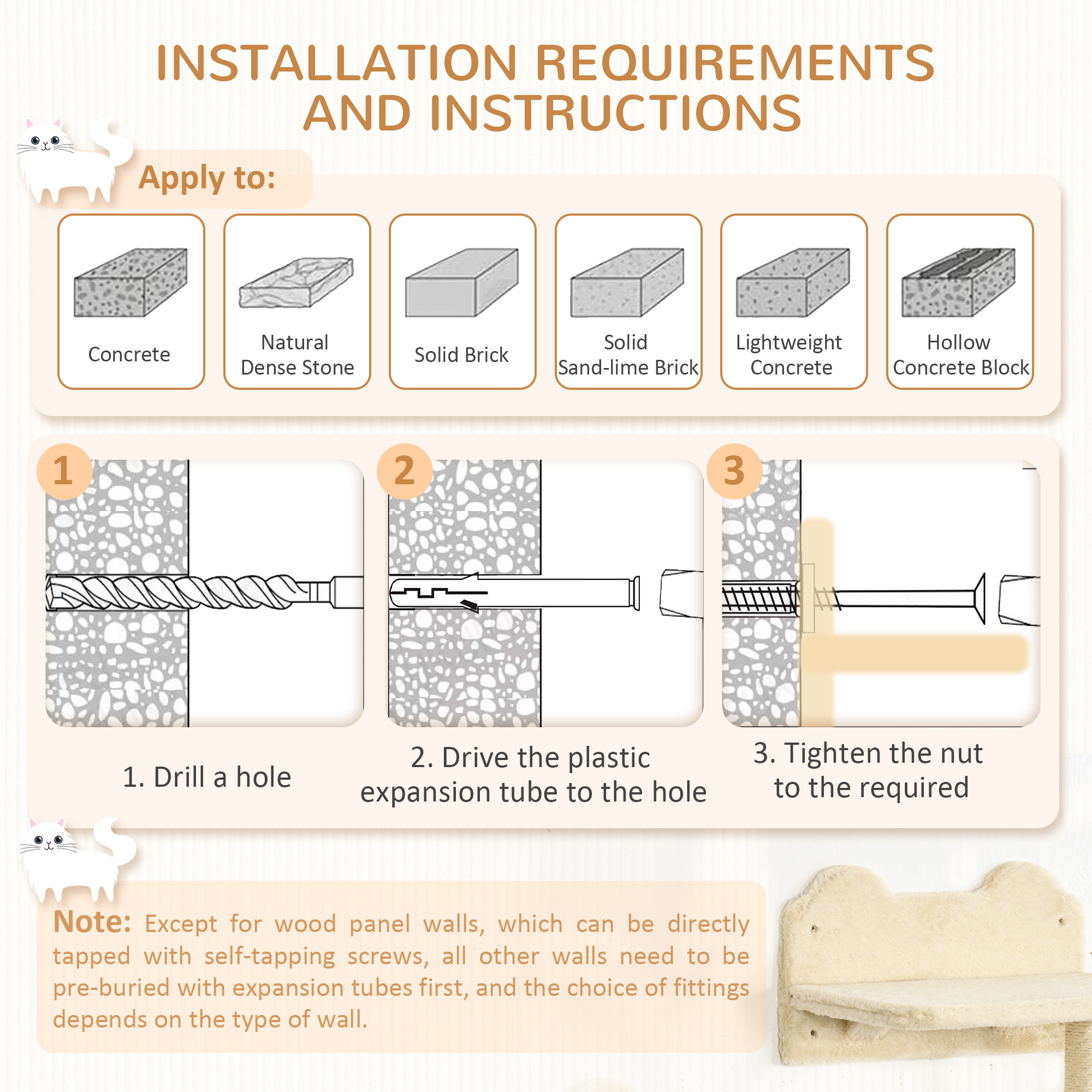 - Note: All walls need to be pre-filled with expansion tubes, except for plank walls, where self-tapping screws can be used directly on the wall