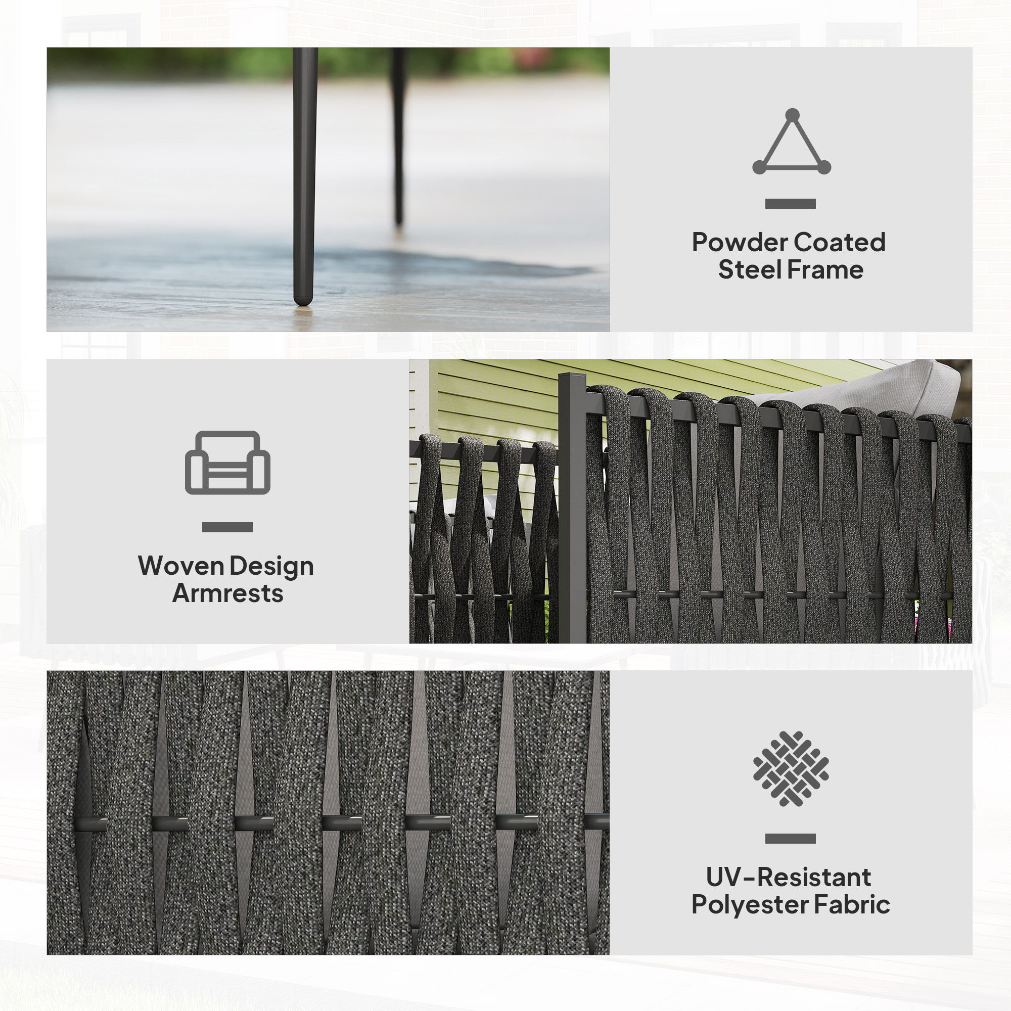 Transform your garden into a cosy haven with the Outsunny outdoor table and chairs. This four-piece ensemble, featuring a loveseat, two armchairs and a coffee table, brings comfort with removable and washable cushions. The faux marble tabletop adds a touch of elegance, making it a stylish addition to any patio furniture set. Enjoy the crafted woven design armrests that blend seamlessly with any outdoor decor.