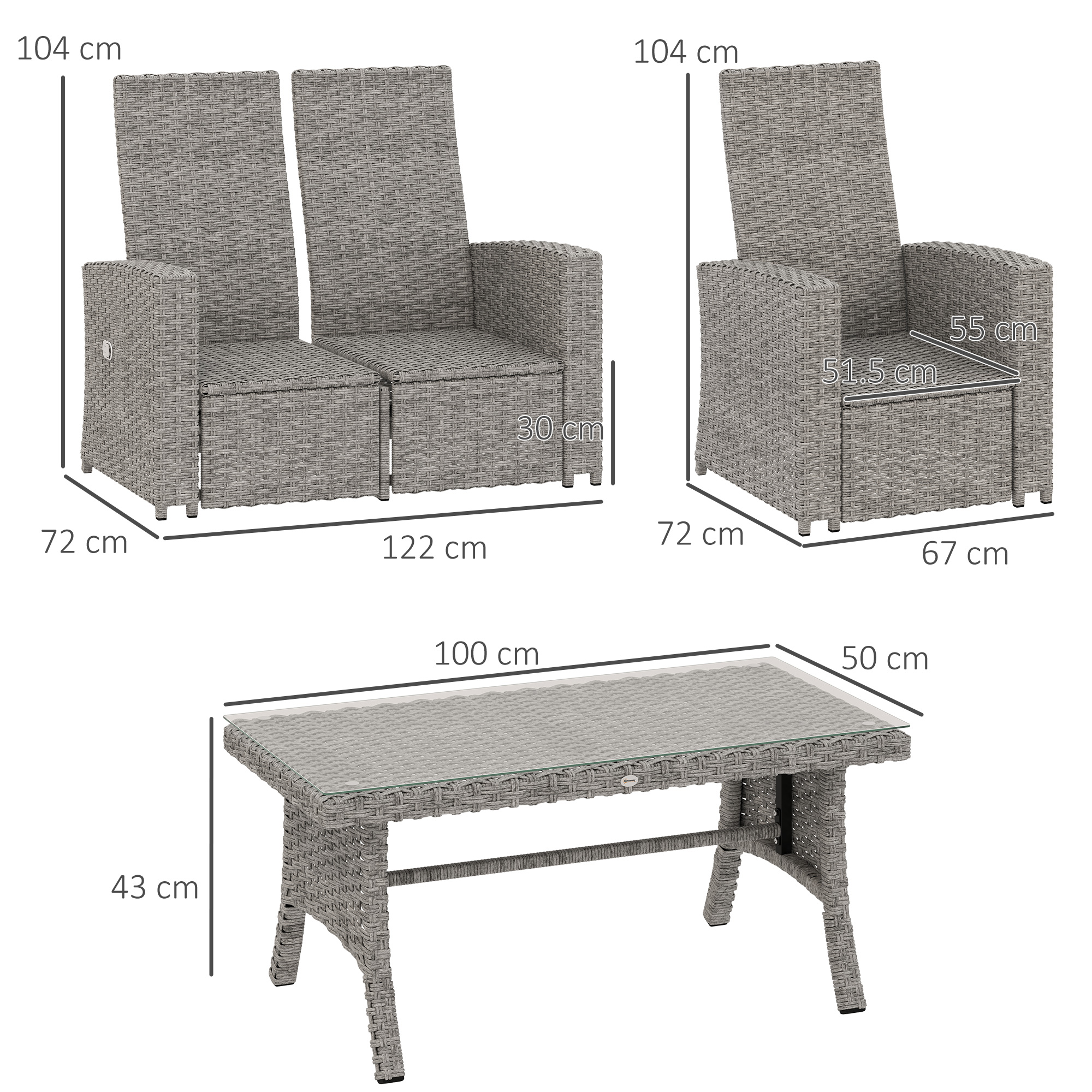 An inviting outdoors, this season and beyond: say hello to this Outsunny rattan furniture set. All pieces have a galvanised steel frame for a strong core, wrapped in plastic wicker for double the durability-and style, of course. The two armchairs have 90°-135° reclining backs-extra relaxing points scored!
