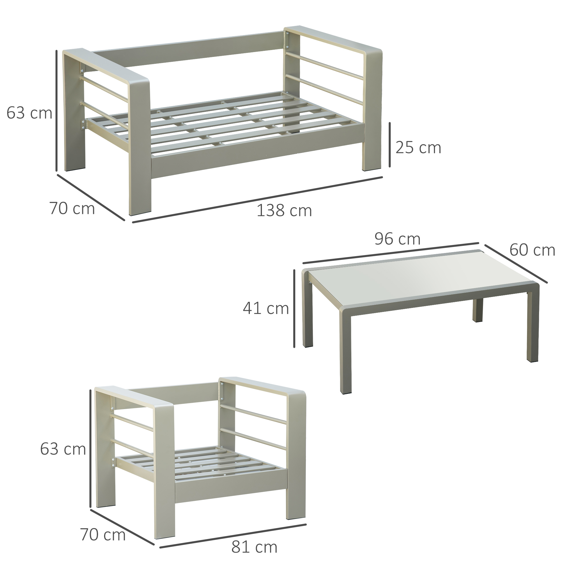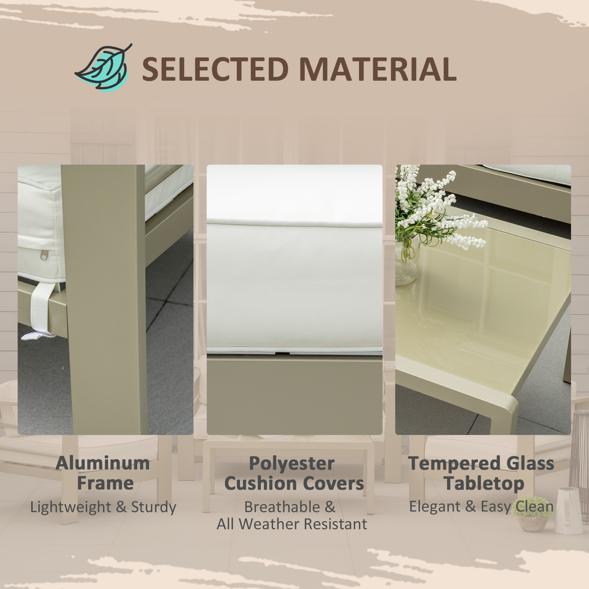 Comfort, with a chic touch - this Outsunny four-piece garden set is here to make an impact in your home, this season and beyond. Each piece is made from powder coated aluminium for a strong core, coated in a champagne gold colour - elegant. Set comes with a two-seater sofa, two armchairs and a matching coffee table, bringing your closest people together. Seat and back cushions for comfort. A glass table top for a sleek finishing touch.