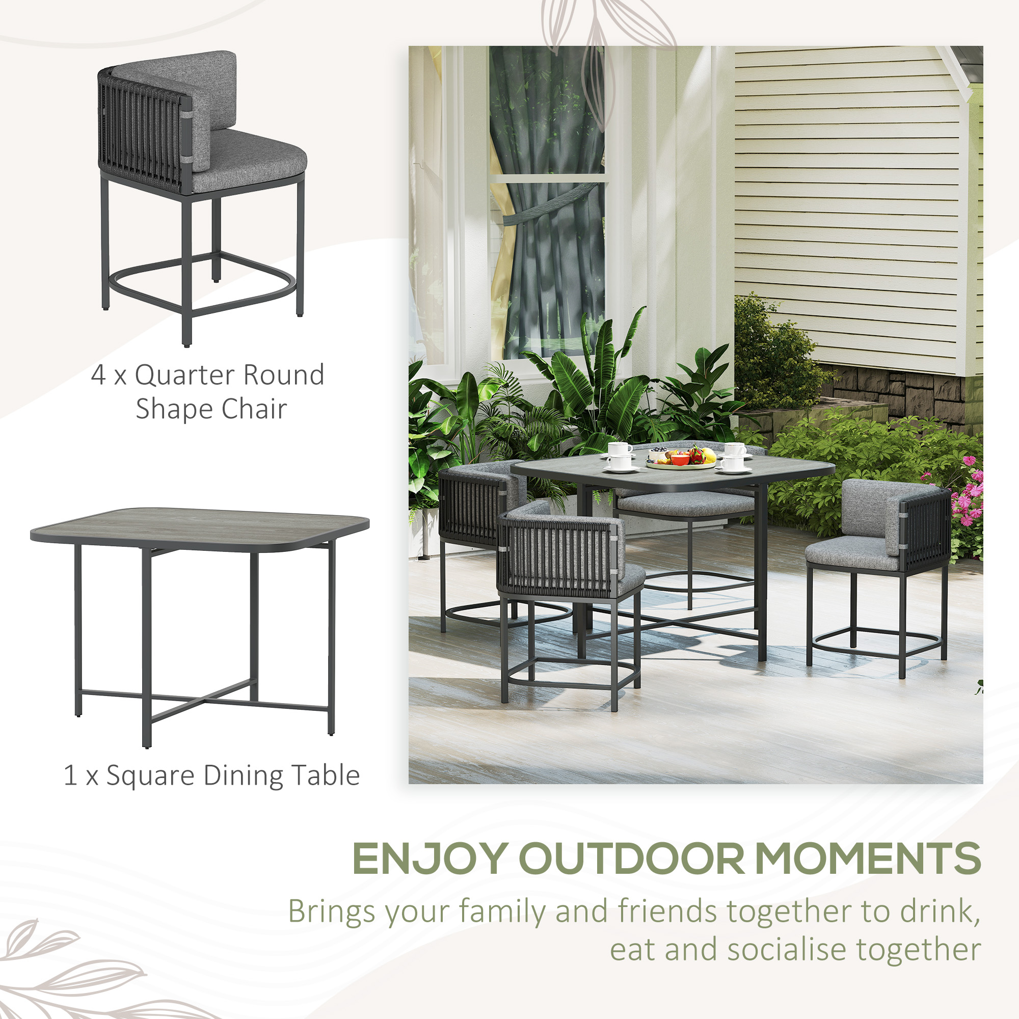 This Outsunny four-person garden table and chairs set brings you and company outdoors. Galvanised steel frames, with a powder coated finish, makes each piece of this outdoor garden furniture set strong at the core, wrapped in plastic rattan - a protective and stylish outer. The wood-effect tabletop is a classic look. Set complete with seat and back cushions for comfort.