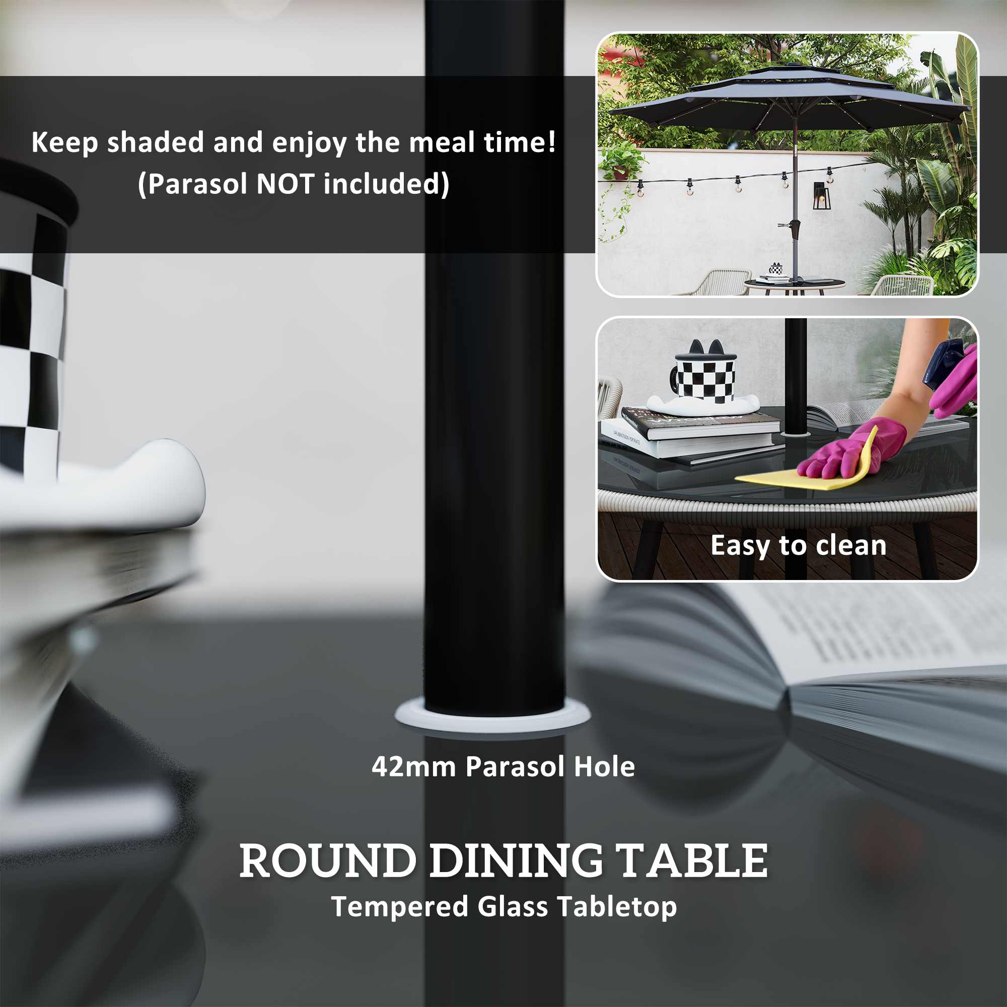 A simple yet reliable way to bring everyone together, this season and beyond with this Outsunny rattan garden table and chairs set. It comes with four chairs and a matching table, with the frames of all pieces made of steel for strength, wrapped in stylish and protective plastic rattan. The twisted rattan back and curved armrests support your body, with padded cushions for comfort. The outdoor dining set is complete with a glass-top table, with Φ4. 2cm middle hole to hold a parasol in place.