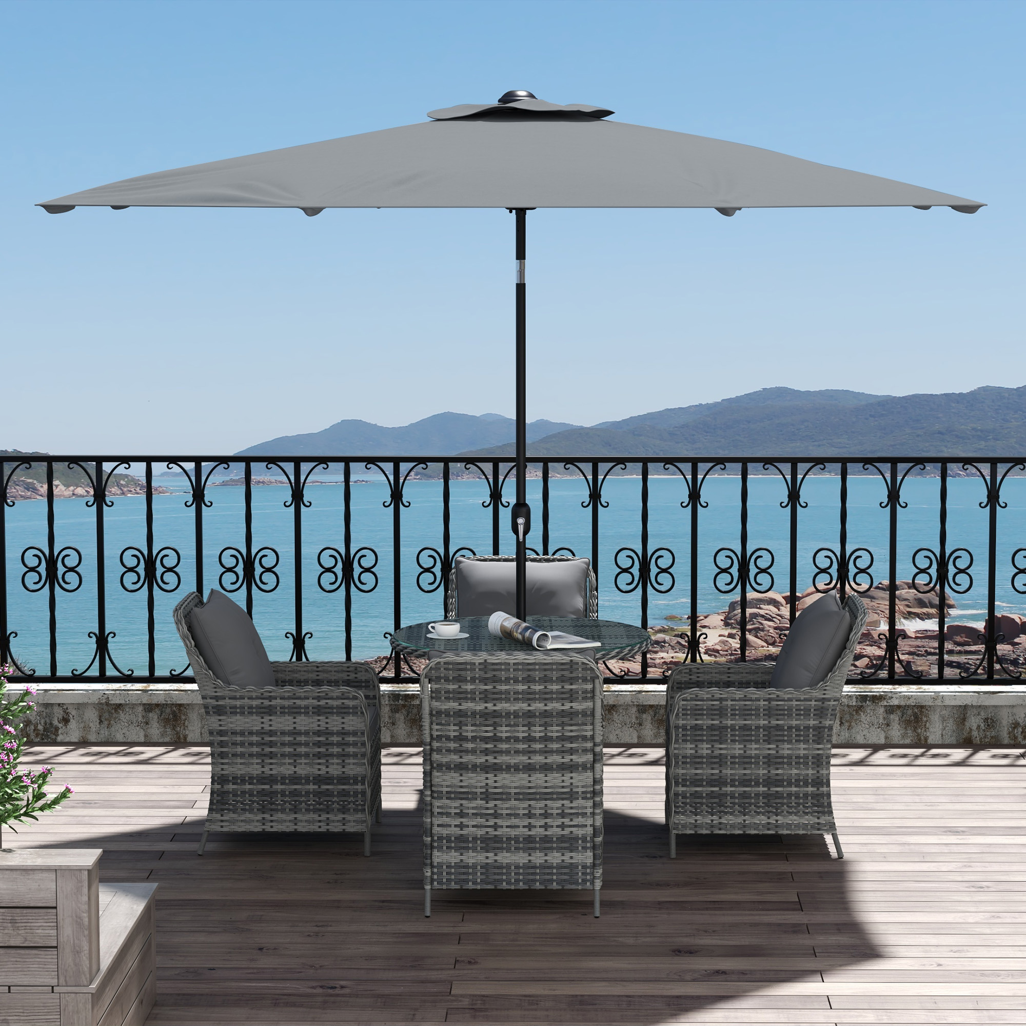 Enjoy stylish outdoor dining, thanks to this Outsunny rattan table and chairs set. This six-piece ensemble includes four armchairs, a round table and parasol umbrella for shade. Each chair comes with a seat and back cushion: relax and dine comfortably. Stylish outdoor dining table and chairs for you and company.