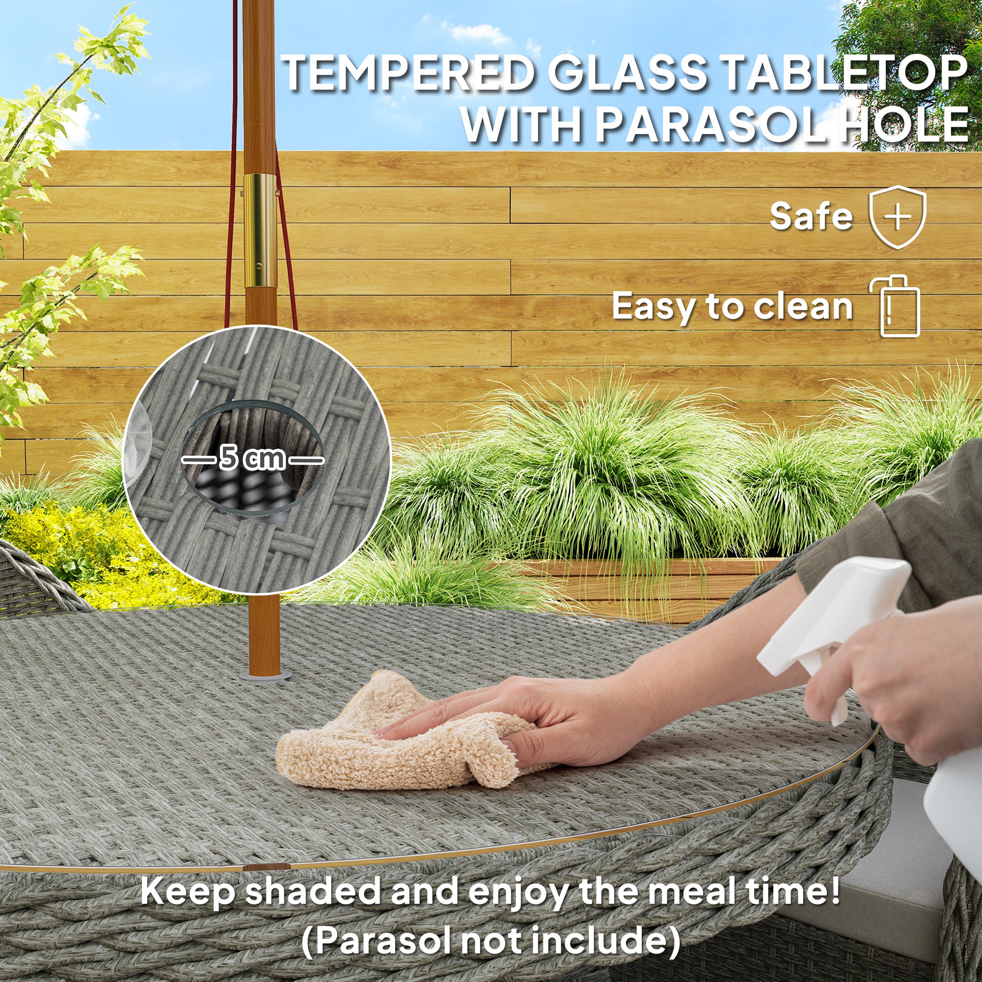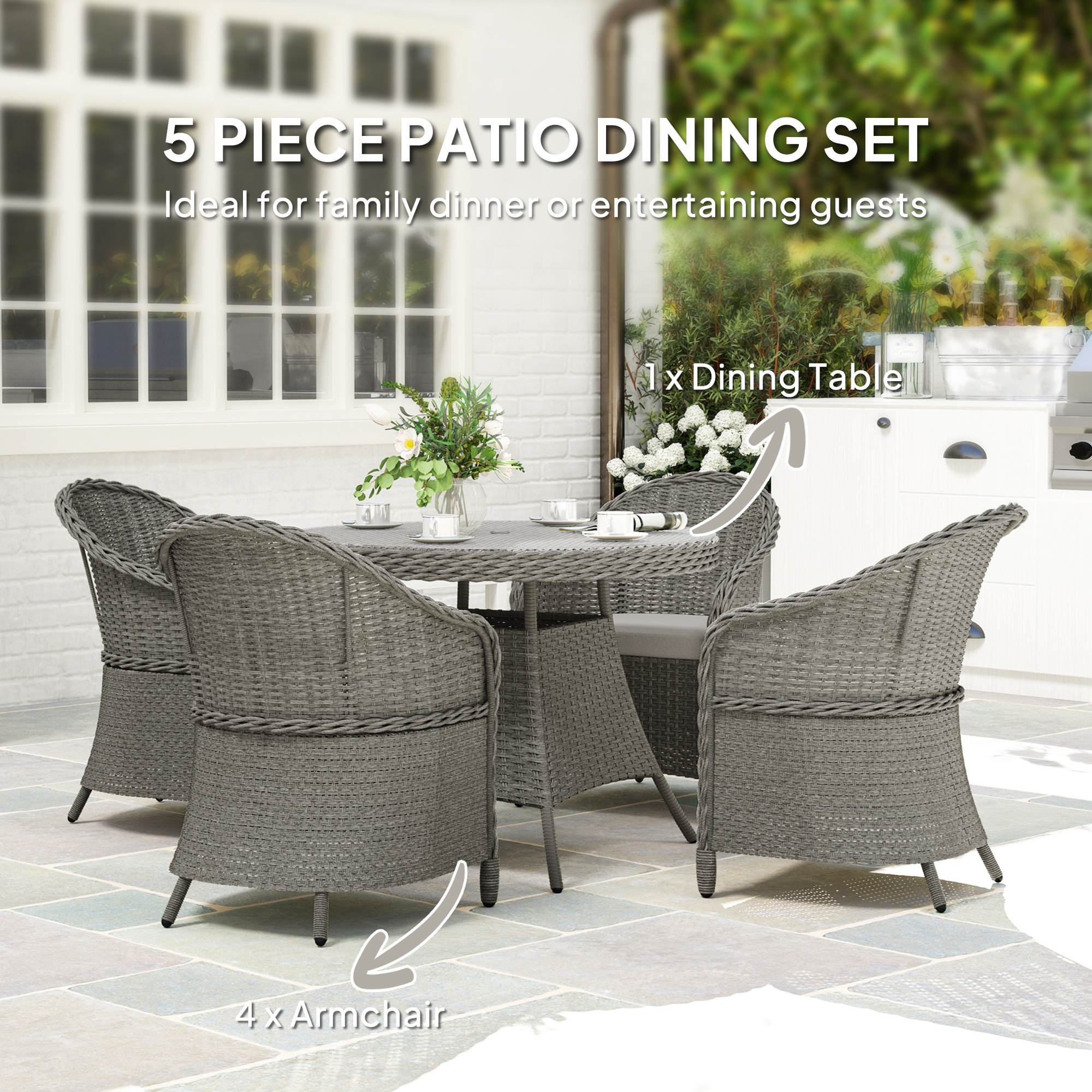 Gathering guests around this season and beyond, don't come as stylish as this. The rattan dining set pairs a sleek glass-top table with on-trend grey rattan for a welcome addition to your garden and outdoor areas. Comes with four armrest chairs, each with a padded seat cushion for comfort and high back and armrests for support. The middle hole in the table of the rattan garden dining set offers a place for a parasol to keep you safely shaded. Relax in comfort and style with Outsunny.